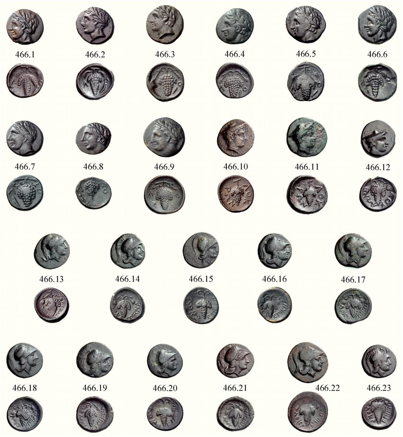 Multiple Lots. Lot of twenty-three bronze coins of Lokri and Lokri Epiknemidii, 4th century BC. The first nine with Apollo head l. / bunch of grapes, L - O and symbols; the next three with Hermes head r. / bunch of grapes and LOK - RWN and the last eleven with Athena helmeted r. / bunch of grapes and LOKR - EPIKNA. 466.1: Æ 1.84 g., 6¢. 466.2: Æ 2.17 g., 11¢. 466.3: Æ 2.07 g., 12¢. 466.4: Æ 1.71 g., 12¢. 466.5: Æ 2.11 g., 2¢. 466.6: Æ 2.93 g., 12¢. 466.7: Æ 2.04 g., 12¢. 466.8: Æ 1.70 g., 12¢. 466.9: Æ 2.09 g., 11¢. 466.10: Æ 2.15 g., 6¢. 466.11: Æ 2.76 g., 6¢. 466.12: Æ 1.95 g., 9¢. 466.13: Æ 1.78 g., 6¢. 466.14: Æ 2.74 g., 1¢. 466.15: Æ 1.63 g., 11¢. 466.16: Æ 1.89 g., 1¢. 466.17: Æ 1.81 g., 12¢. 466.18: Æ 1.99 g., 12¢. 466.19: Æ 2.16 g., 12¢. 466.20: Æ 1.41 g., 12¢. 466.21: Æ 2.16 g., 1¢. 466.22: Æ 2.03 g., 12¢. 466.23: Æ 1.74 g., 12¢. Some very rare or extremely rare. Mostly patinated and averaging very fine. 466.1: L and O to l. and r., cnemis symbol to r. Corpus group 15, 39b. 466.2: L and O to l. and r., cnemis symbol to r. Corpus group 15, 36a. 466.3: [L] and O to l. and r., cnemis symbol to r. Corpus group 15, 15b. 466.4: L and O to l. and r., cnemis symbol to r. Corpus group 15. 466.5: L and O to l. and r., cnemis symbol to r. Corpus group 15, 4b. 466.6: L and [O] to l. and r., cnemis symbol to l. Corpus group 16, 1a. 466.7: L and O to l. and r., cnemis symbol to l. Corpus group 16, 23a. 466.8: L and O to l. and r., cnemis symbol to l. Corpus group 16, 6a. 466.9: To l. and r., L and O; to l., ivy leaf upwards. Acquired from Baldwin’s, January 1976, for £ 24 (ex Harlan Berk). Corpus group 17, 9a. BMC 54, pl. II, 7. SNG Cop 72. Fitzwilliam (McClean) 5457, pl. 198, 22. 466.10: Rare. LOK - RWN r. down and l. down. Ex Sotheby’s London 9 March 1989 [Hopper] lot 524 (part). Corpus group 9, 1a. SNG Cop 73. Fitzwilliam (McClean) 5462, pl. 198, 24. Picard, Antre, p. 287, A, fig. 2, 26 - 27. 466.11: Rare. LOK - RWN r. down and l. down. Corpus group 9, 2a. SNG Cop 73. Fitzwilliam (McClean) 5462, pl. 198, 466.12: Extremely rare. LOK r. down, RWN l. up. Corpus group 10.1, 1a. One of two known, the other is lot 122 above, from the same reverse die. 466.13: LOKR - EPIKNA l. down and r. up. Corpus group 12, 35a. SNG Tübingen 1578. 466.14: LOKR - EPIKNA l. down and r. up. Corpus group 12, 135a. SNG Sweden 1380. 466.15: LOKR - EPIKNA l. down and r. up. Reverse style differs from the above two. Same reverse die as 466.20 below. Corpus group 12. 466.16: LOKR - EPIKNA l. down and r. up. Reverse style (hand) as 466.14 above. Ex Giessener Münzhandlung Gorny & Mosch 152 (9 October 2006) lot 2801 (part). Corpus group 12. 466.17: LOKR - EPIKNA l. down and r. up. Corpus group 12, 112a. 466.18: LOKR - EPIKNA l. down and r. up. Corpus group 12, 111a. 466.19: LOKR - EPIKNA l. down and r. up. Corpus group 12, 76a. 466.20: LOKR - EPIKNA l. down and r. up. Same reverse die as 466.15 above. Corpus group 12, 6a. 466.21: LOKR - EPIKNA l. down and r. up. Corpus group 12, 68a. 466.22: LOKR - EPIKNA l. down and r. up. More spread fabric and bigger types. Corpus group 12, 104a. 466.23: Extremely rare. LOKR - EPIKNA l. down and r. up. Above helmet on obverse, PU. Corpus group 12.1, 2a. Same reverse die as lot 125 above and one of only four such pieces known. 24. Picard, Antre, p. 287, A, fig. 2, 26 - 27.