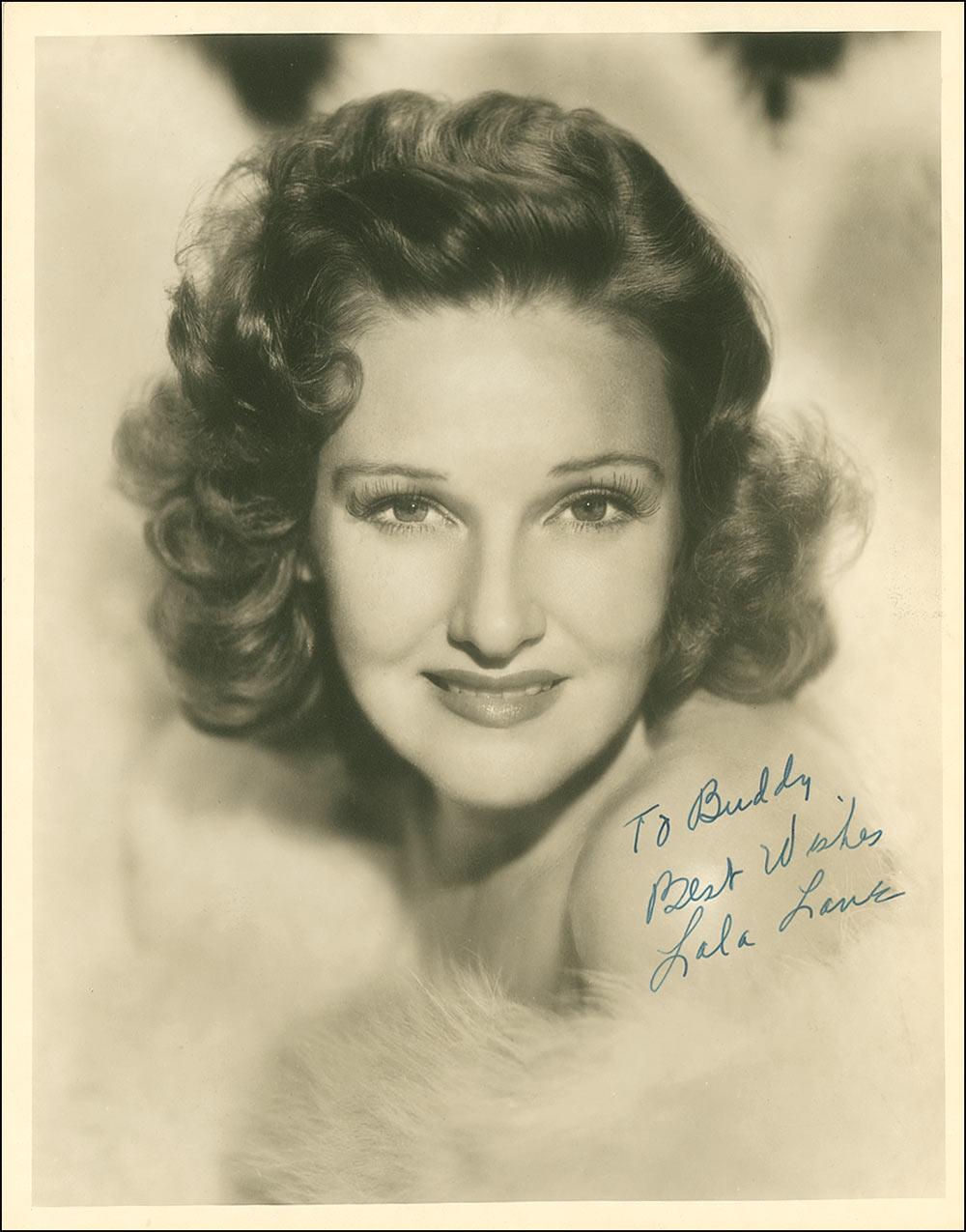 Vintage matte-finish 8 x 10 photo of Lane wrapped in a fur, signed and inscribed in-person in fountain pen “To Buddy, Best Wishes, Lola Lane.” In fine condition. From the collection of in-person Hollywood collector Buddy George Marshall