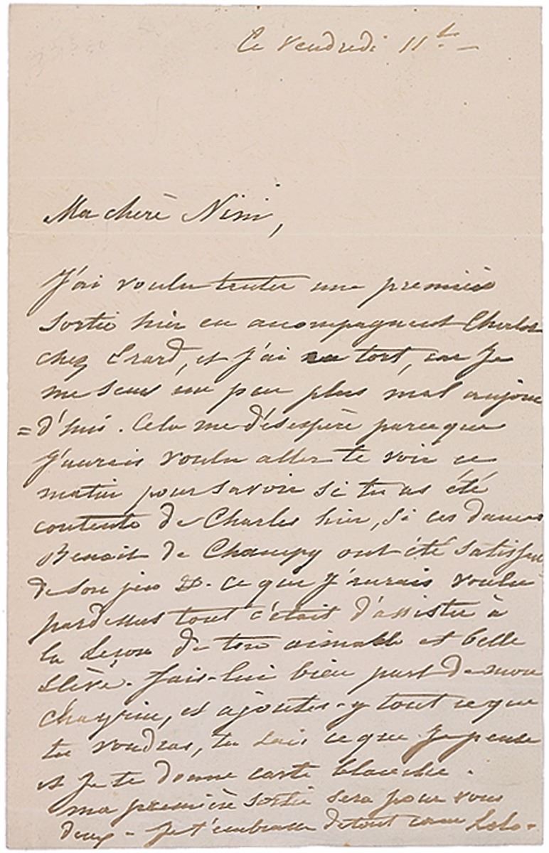 Irish dancer and actress (1821–1861) who became famous as a ‘Spanish dancer,’ courtesan, and the mistress of King Ludwig I of Bavaria, who made her Countess of Landsfeld. ALS in French, signed “Lola,” one page, 5.25 x 8.25, no date. Letter to Nini, in full (translated): “I wanted to attempt a first outing yesterday accompanying Charles to Erard’s, but I was wrong as I am feeling a little worse today. This is disappointing because I should have liked to go and see you this morning to find out if you were happy with Charles yesterday, and if the Benoit ladies from Champy were satisfied with his father. What I should have liked above all was to be present at the lesson of your charming and beautiful pupil. Let her know of my disappointment, and add anything you think appropriate, you know what I think and give you carte blanche. My first outing will be to you both.” In fine condition, with several horizontal folds and light creasing.