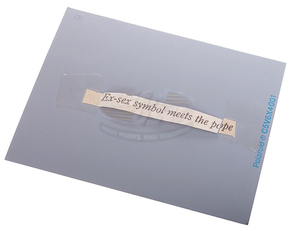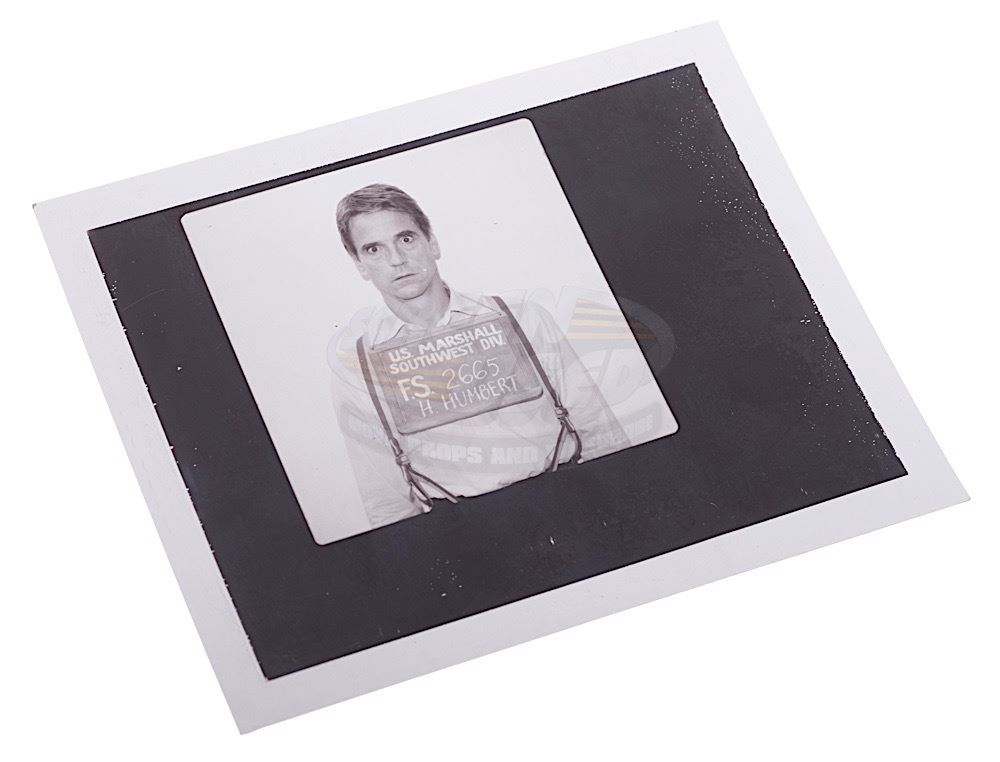 (Samuel Goldwyn Company,1997) This is a mugshot of Jeremy Irons as "Humbert", printed for use during filming. The photo features "Humbert" being booked by the US Marshals and on the back is a paper clipping "Ex-sex symbol meets the Pope". Measures 4.25" x 3.25".