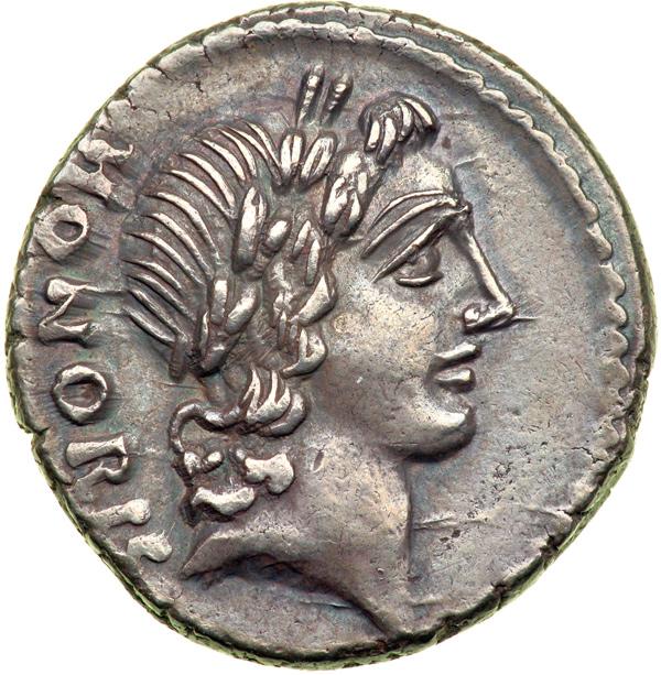 Lollius Palikanus, moneyer. AR Denarius minted at Rome, c. 45 BC. Head right of Honoria. Reverse: Curule chair between two ears of grain. Lollia 1; Cr. 473/2; Syd. 961. Rare. Extremely Fine.