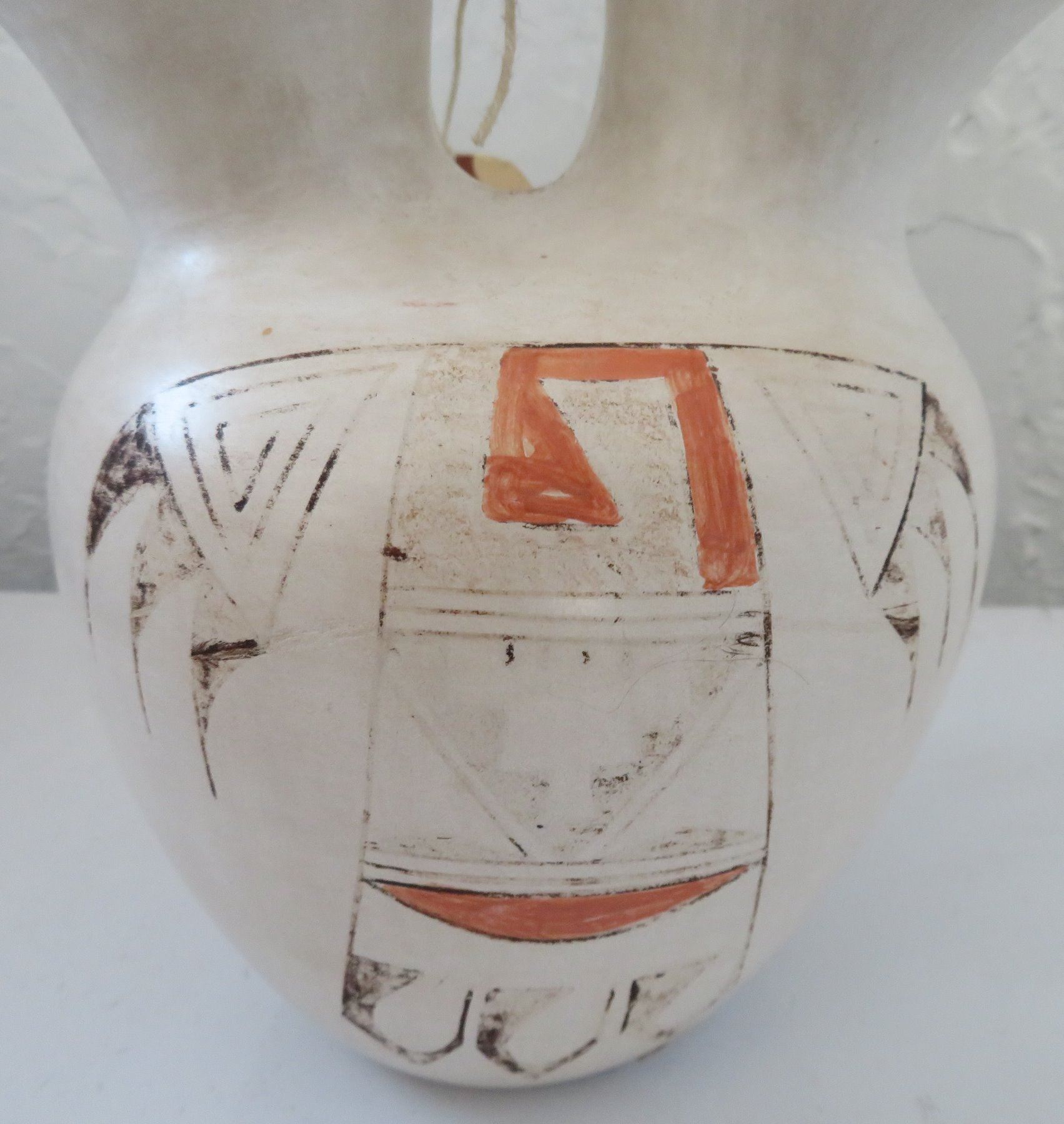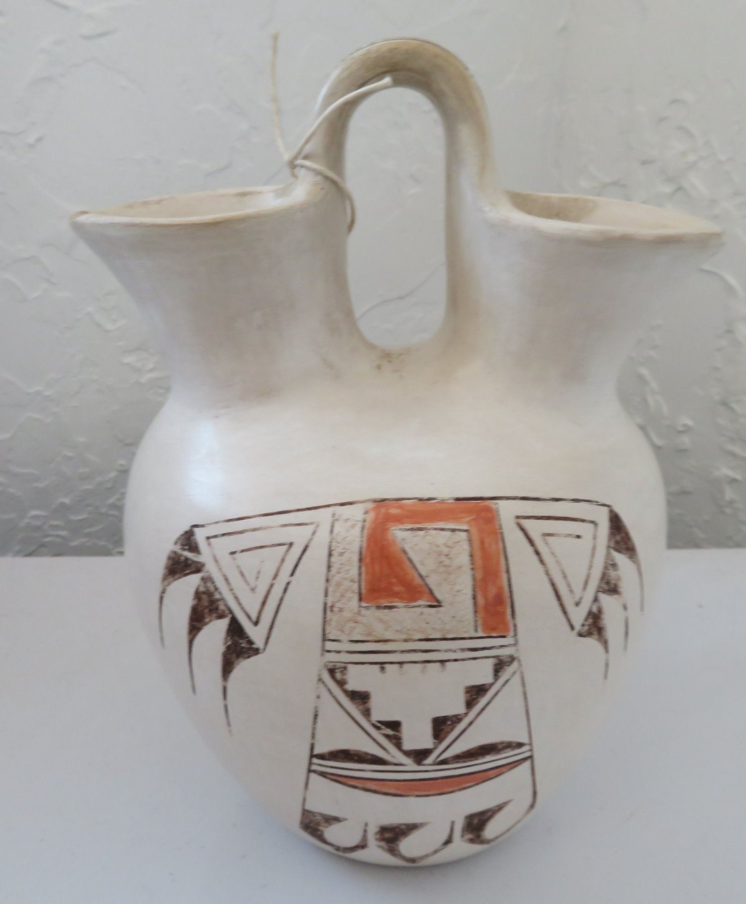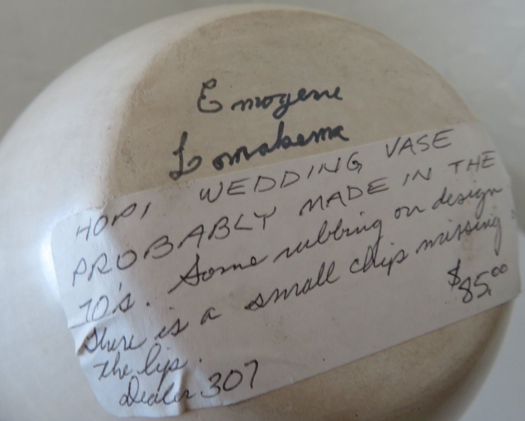 Lomakema Hopi Wedding Pot, c. 1970s. Made of clay and paint, the item measures 8 1/2" x 6" x 5". Hopi, Arizona. Emogene Lomakema, 1901-1999. Lomakema's work is highly sought after. Condition: Good, see images. Shipping: $45.00 w/insurance and signature, double-boxed.