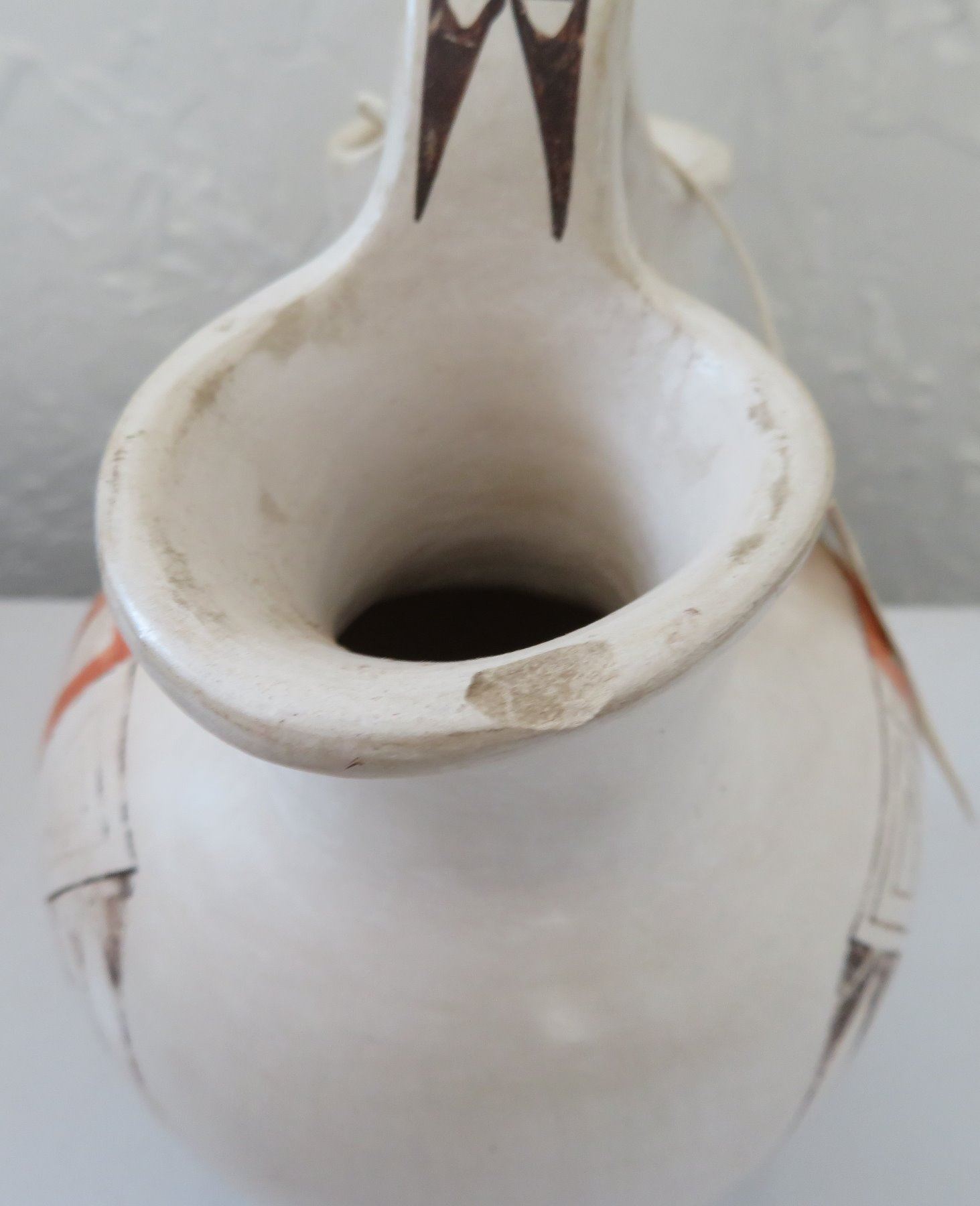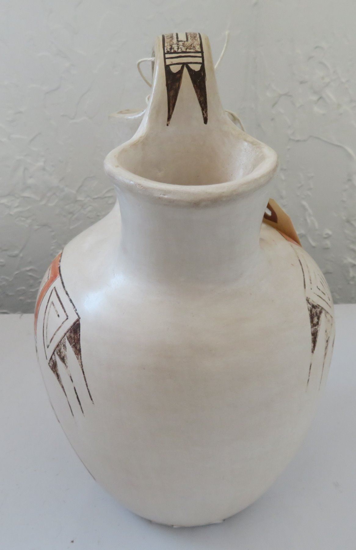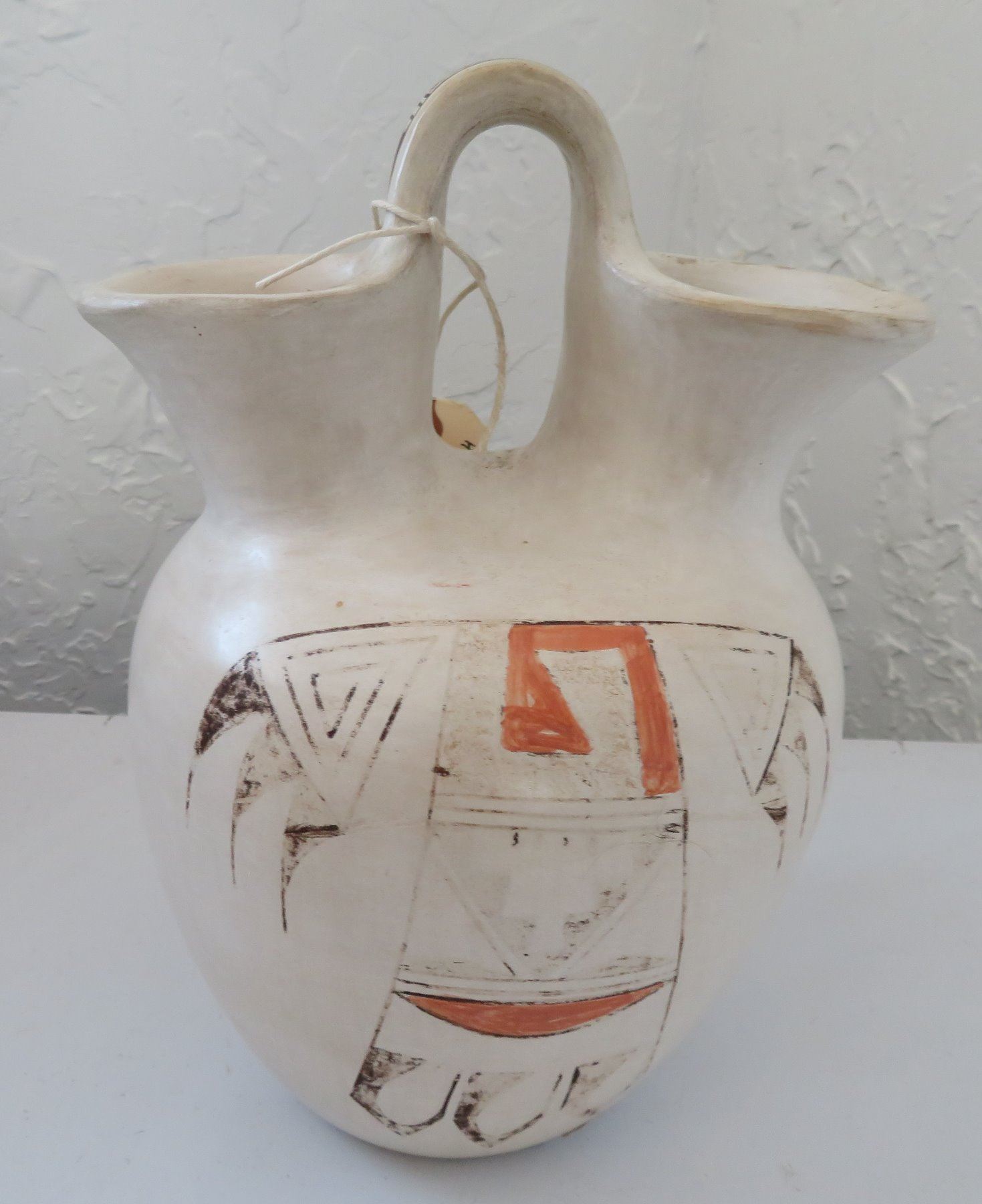 Lomakema Hopi Wedding Pot, c. 1970s. Made of clay and paint, the item measures 8 1/2" x 6" x 5". Hopi, Arizona. Emogene Lomakema, 1901-1999. Lomakema's work is highly sought after. Condition: Good, see images. Shipping: $45.00 w/insurance and signature, double-boxed.