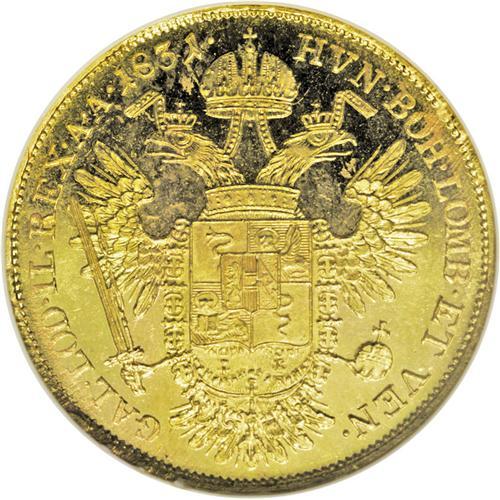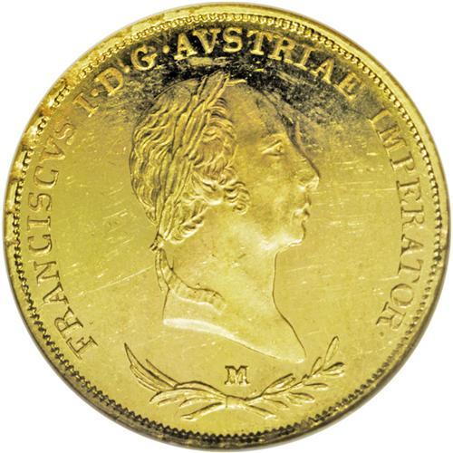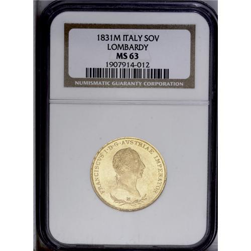 <B>Lombardy-Venetia. Franz I gold Sovrano 1831M,</B></I> KM-C11.1, MS63 NGC. Fully brilliant, with prooflike field, light abrasions, and nice cameo contrast.