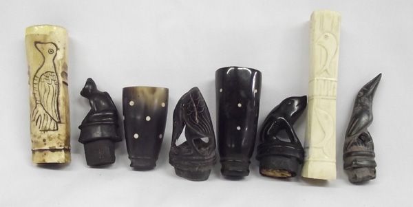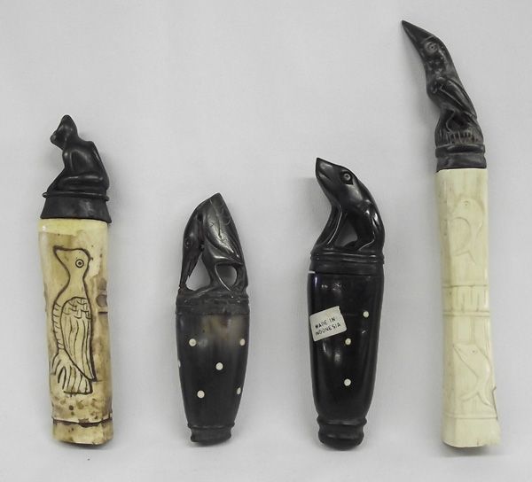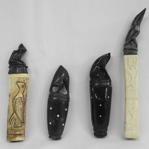 Group of vintage, traditional carved horn and bone herb boxes. Two are Water Buffalo horn; 1 is horn with natural Water Buffalo bone; and one is carved Water Buffalo bone with carved wood top. From Lombok, Indonesia. Largest measures 8'' x 7/8''.