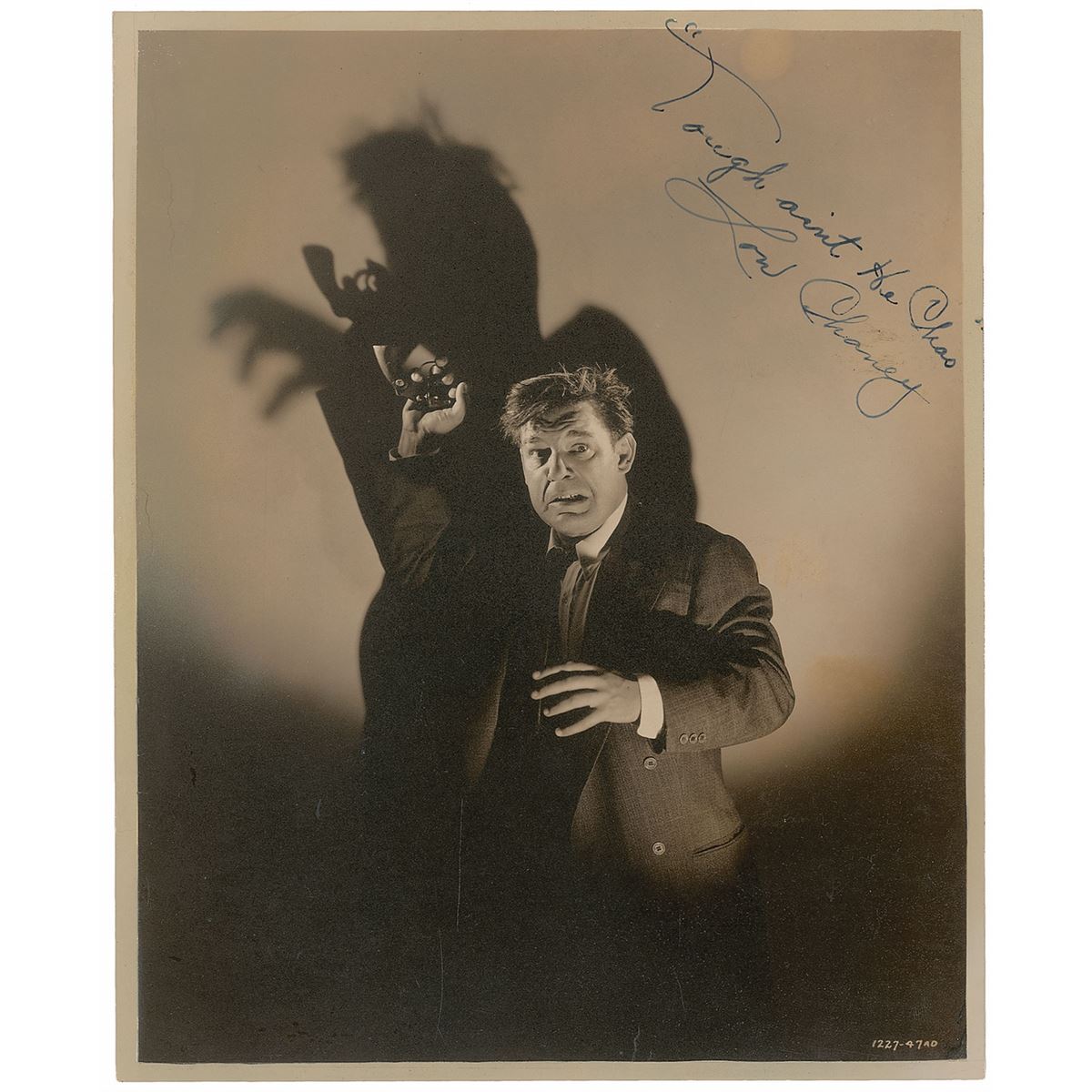 Vintage matte-finish 7.5 x 9.25 image of a gun-wielding Chaney, Jr. from the 1942 crime-drama Eyes of the Underground, signed and inscribed in fountain pen, “‘Tough aint He Chas,’ Lon Chaney.” Professionally cleaned, discreet repairs to two surface cracks near the left edge, and skillfully re-backed to restore missing left and bottom edges, otherwise fine condition. The resulting photo displays beautifully, perfectly capturing Chaney against a backdrop of eerily menacing shadows.