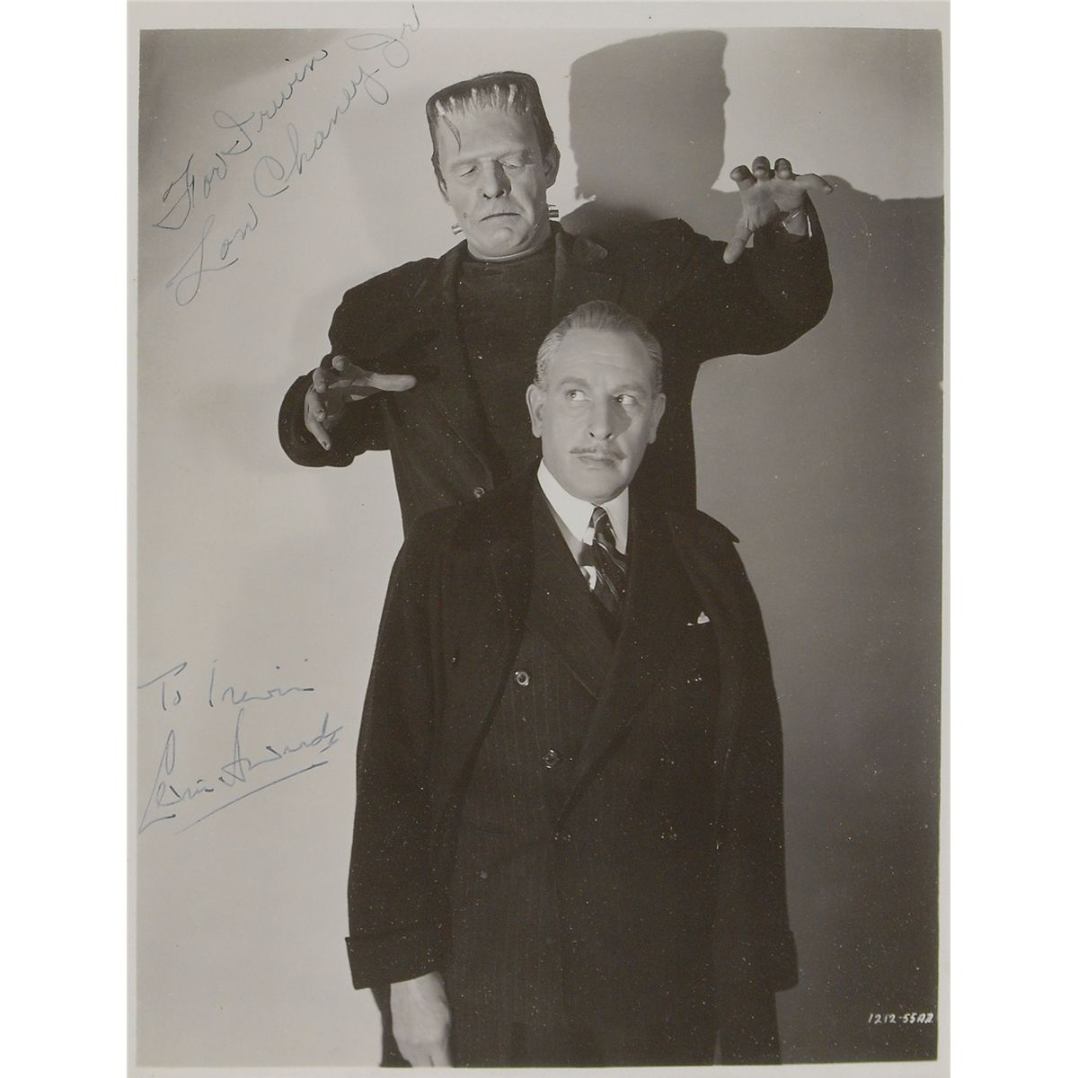 Terrific vintage glossy 7.5 x 9.75 photo from the classic 1942 Universal horror film The Ghost of Frankenstein, showing Hardwicke as Ludwig Frankenstein and Chaney as the Monster, signed and inscribed in fountain pen, “For Irwin, Lon Chaney, Jr.,” and “To Irwin, Cedric Hardwicke.” Expertly double-matted and framed to an overall size of 15.5 x 17.5. In fine condition, with scattered creases. The Ghost of Frankenstein was the fourth installment of Universal Pictures’ series of screen adaptations of the gruesome horror tale, and the first to replace Boris Karloff with Chaney in the role of the Monster. Chaney became the studio’s leading horror actor throughout the 1940s and holds the distinction of being the only actor to portray all four of Universal's major horror characters: the Wolf Man, Frankenstein's Monster, the Mummy, and Count Dracula. Signed photos portraying these familiar characters in full costume and makeup are amongst the most desirable in all of classic entertainment.