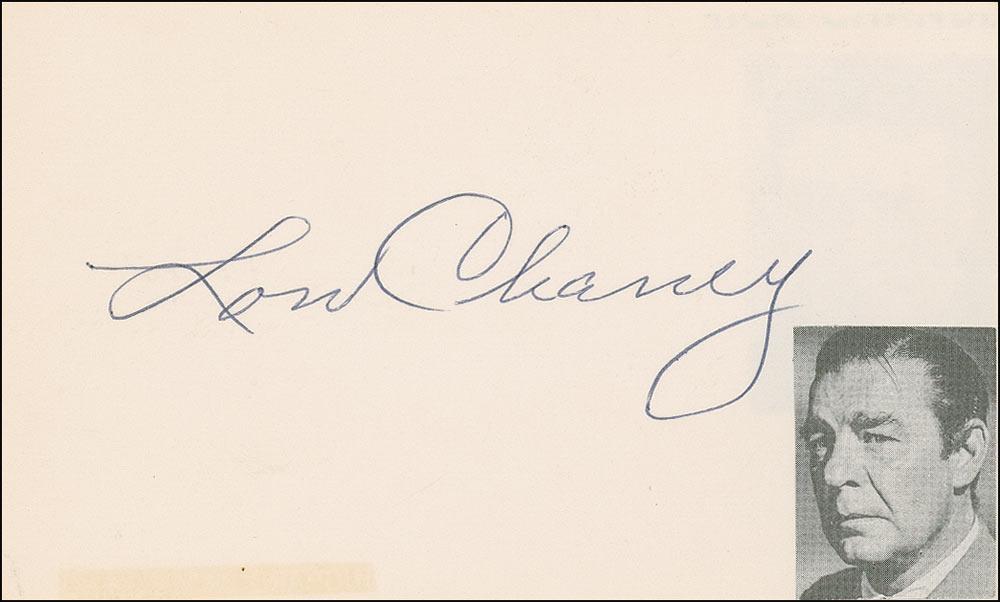 Vintage ballpoint in-person signature, “Lon Chaney,” on an off-white 5 x 3 card with a small clipped photo affixed to lower right. In fine condition, with some light toning along bottom edge.