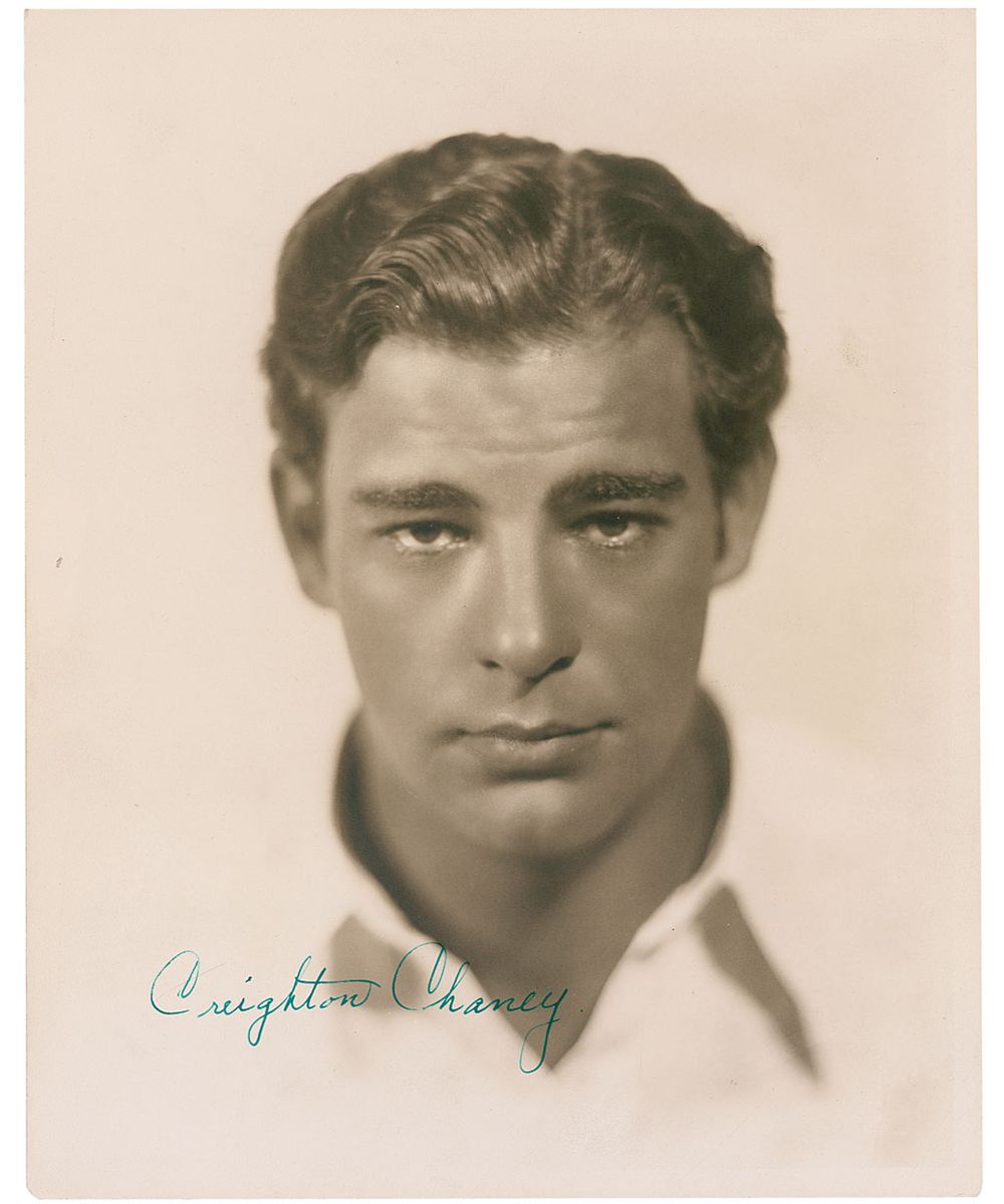 Popular character actor (1906–1973) who attained fame playing such classic horror characters as the Wolf Man, Frankenstein’s monster, the Mummy, and the Son of Dracula. Super-rare vintage matte-finish 8 x 9.75 head-and-shoulders photo, signed in green fountain pen, “Creighton Chaney.” In fine condition, with some slight edge toning and creasing to lower right corner. An handsome portrait enhanced by this early, highly sought-after version of his signature.