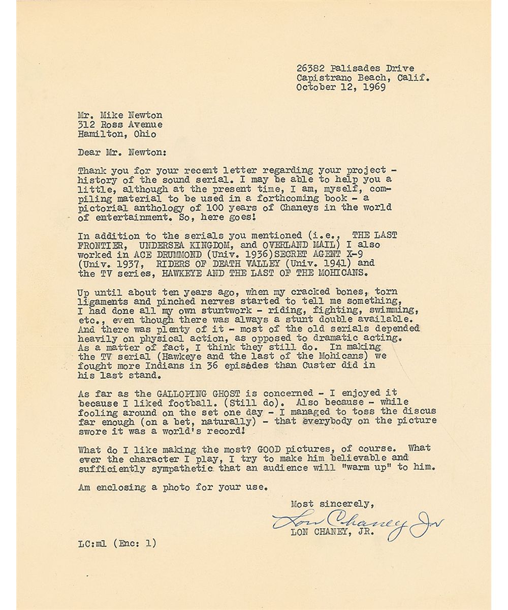 TLS, one page, 8.5 x 11, October 12, 1969. Letter to an admirer. In part: “Thank you for your recent letter regarding your project—history of the sound serial…I am, myself, compiling material to be used in a forthcoming book—a pictorial anthology of 100 years of Chaneys in the world of entertainment…Up until about ten years ago, when my cracked bones, torn ligaments and pinched nerves started to tell me something, I had done all my own stuntwork…most of the old serials depended heavily on physical action…As a matter of fact…in making the TV serial (Hawkeye and the Last of the Mohicans) we fought more Indians in 36 episodes than Custer did in his last stand…What do I like making the most? Good pictures, of course. What ever the character I play, I try to make him believable and sufficiently sympathetic that an audience will ‘warm up’ to him.” In fine condition. Accompanied by the return mailing label, filled out in another hand.