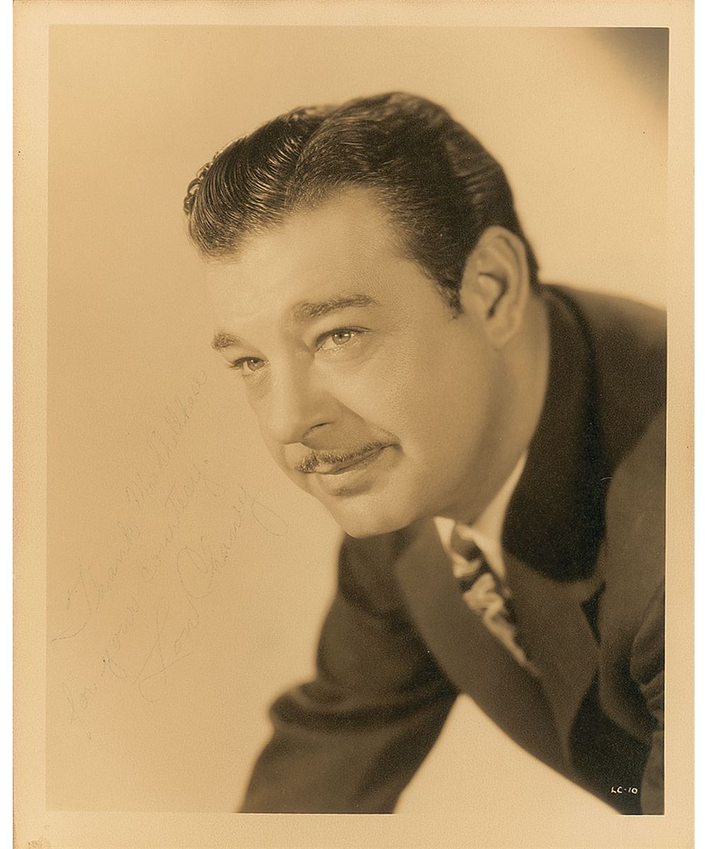 Desirable vintage matte-finish 8 x 10 publicity portrait, signed and inscribed in black ink, “Thanks Mrs. Shellhase for your courtesy. Lon Chaney.” Signature and inscription light but legible, otherwise fine condition.