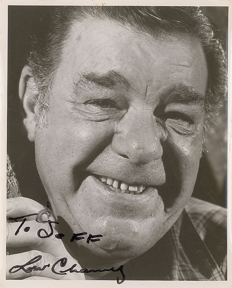Glossy 8 x 10 close-up photo of Chaney from late in his career, signed and inscribed in black felt tip, “To Jeff, Lon Chaney.” In very good to fine condition, with scattered creases and surface marks, and a light brush to inscription.