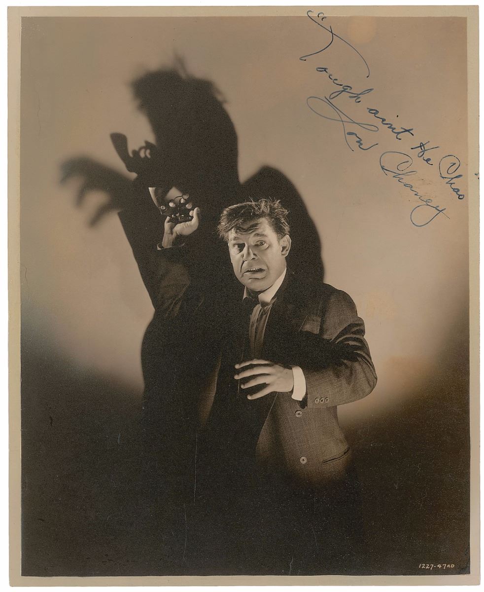 Vintage matte-finish 7.5 x 9.25 photo of a frightened Lon Chaney, Jr., from the 1942 crime-drama Eyes of the Underground, signed and inscribed in fountain pen, “‘Tough aint He Chas,’ Lon Chaney.” Professionally cleaned, discreet repairs to two surface cracks near the left edge, and skillfully re-backed to restore missing left and bottom edges, otherwise fine condition. The resulting photo displays beautifully, perfectly capturing Chaney against a backdrop of eerily menacing shadows.