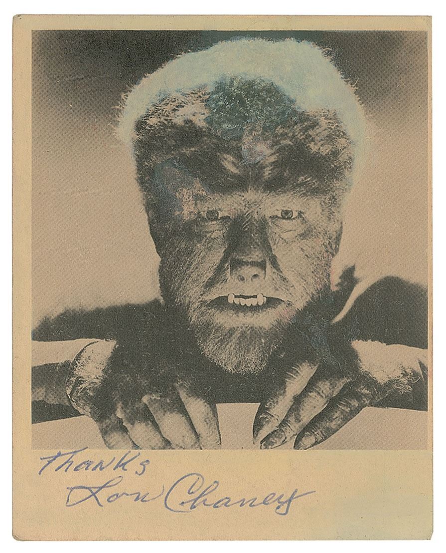 Hugely appealing 4 x 5 cardstock photo of Chaney in his signature role as the Wolfman, signed in the lower border in black ballpoint, "Thanks, Lon Chaney." In very good to fine condition, with white paint applied to the top of his head for inexplicable reasons. Chaney remains terrifically rare in signed photos of his most famous character—a frightfully delightful close-up pose.