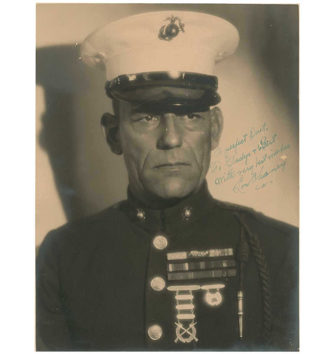 Scarce vintage matte-finish 10 x 13 Ruth Harriet Louise MGM publicity photo of Chaney in a military uniform for his role in the 1926 film Tell It to the Marines, signed and inscribed in fountain pen “A perfect duet, to Gladys & Bert, with very best wishes, Lon Chaney.” In very good condition, with a crease and two surface dings to the upper left, light scattered surface loss, silvering to the borders, and lightly trimmed edges. One of few oversized Chaney portraits we have offered.