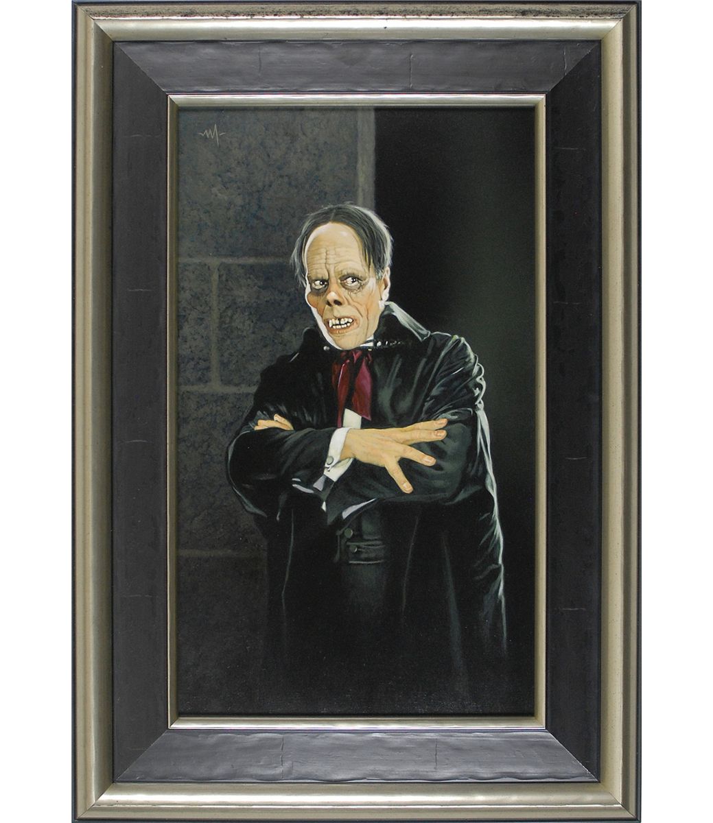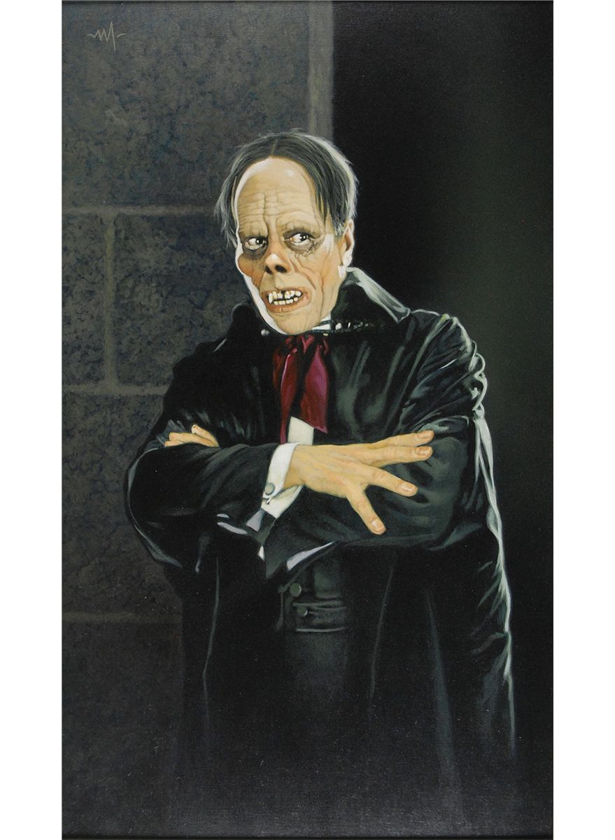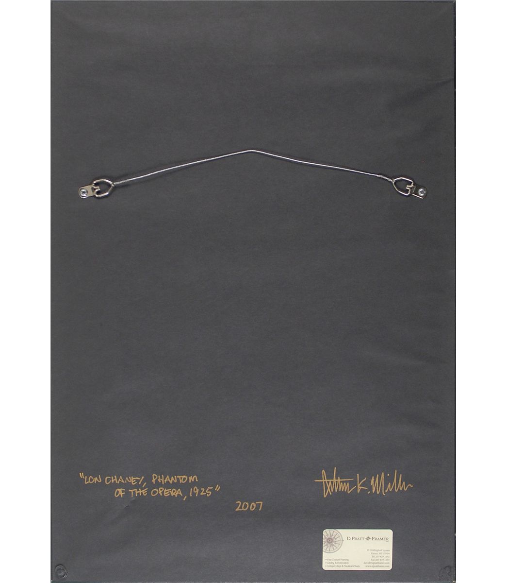 Superb original color painting entitled ‘Lon Chaney, Phantom of the Opera, 1925,’ done by artist Arthur K. Miller, acrylic on Masonite, 9 x 15.5, depicting Chaney in full costume and makeup for the iconic title role. Signed in the upper left corner of the background, “M,” and titled, dated and signed in full by the artist on the reverse. Framed to an overall size of 14.75 x 21.25. In fine condition. An artist from York Beach, Maine, Miller’s acrylic paintings are collected internationally. They have graced the covers of many publications, and some were featured in a one-man show at the National Baseball Hall of Fame for more than five years. This particular portrait was featured in the exhibition, ‘Classic Horror: Movie Monsters from the Golden Era,’ a one-man-show of Miller's work that ran in New York City during January and February of 2010.