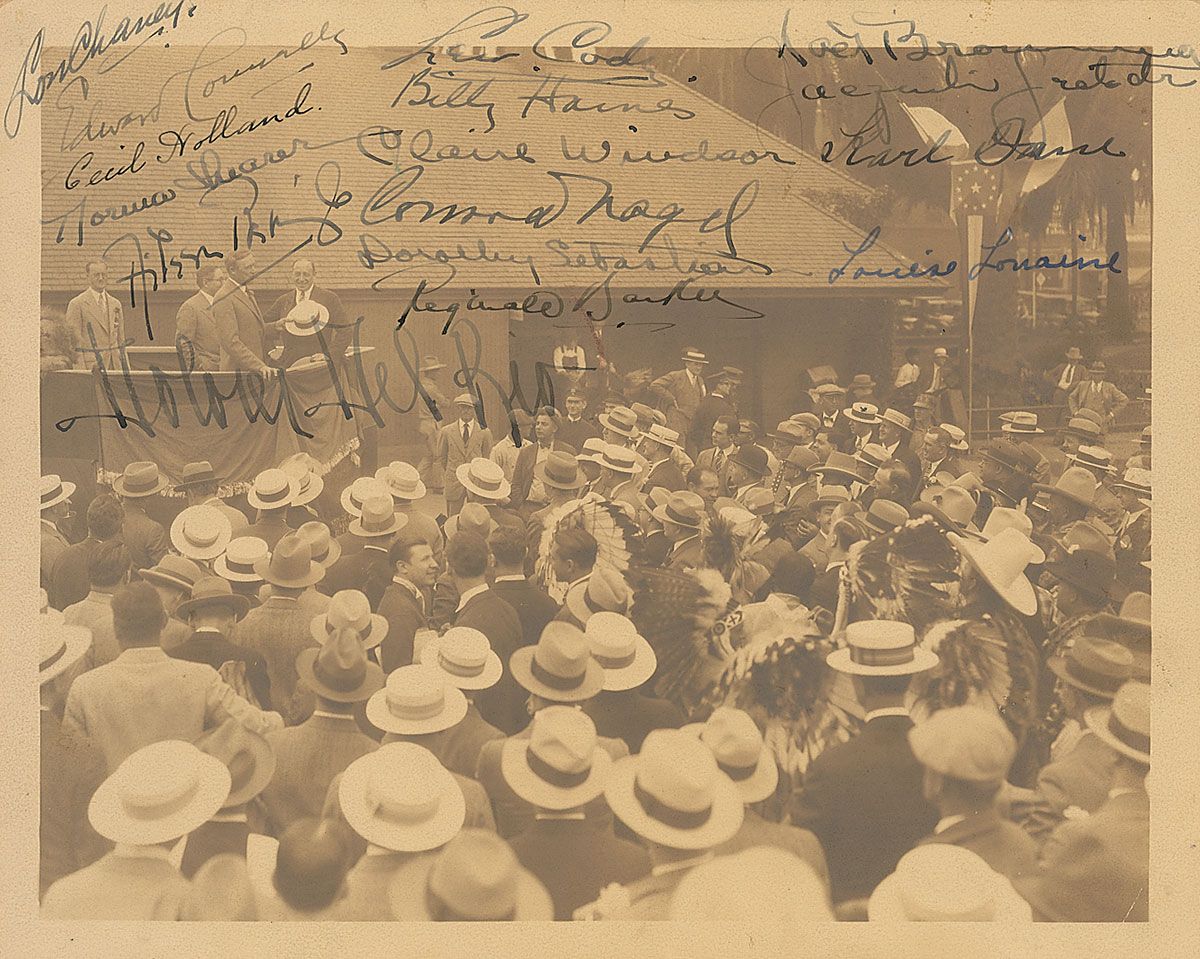 Vintage sepia matte-finish 10 x 8 photo taken at the Metro-Goldwyn-Mayer convention luncheon for its distributors on May 19, 1927, signed in fountain pen by 16 MGM stars and employees. Signers include: Lon Chaney, Conrad Nagel, Dolores Del Rio, Edward Connelly, Cecil Holland (head of the make-up department), Norma Shearer, Aileen Pringle, Lew Cody, Claire Windsor, Billy Haines, Dorothy Sebastian, Reginald Barker, Karl Dane, Louise Lorraine, and two others. In fine condition.