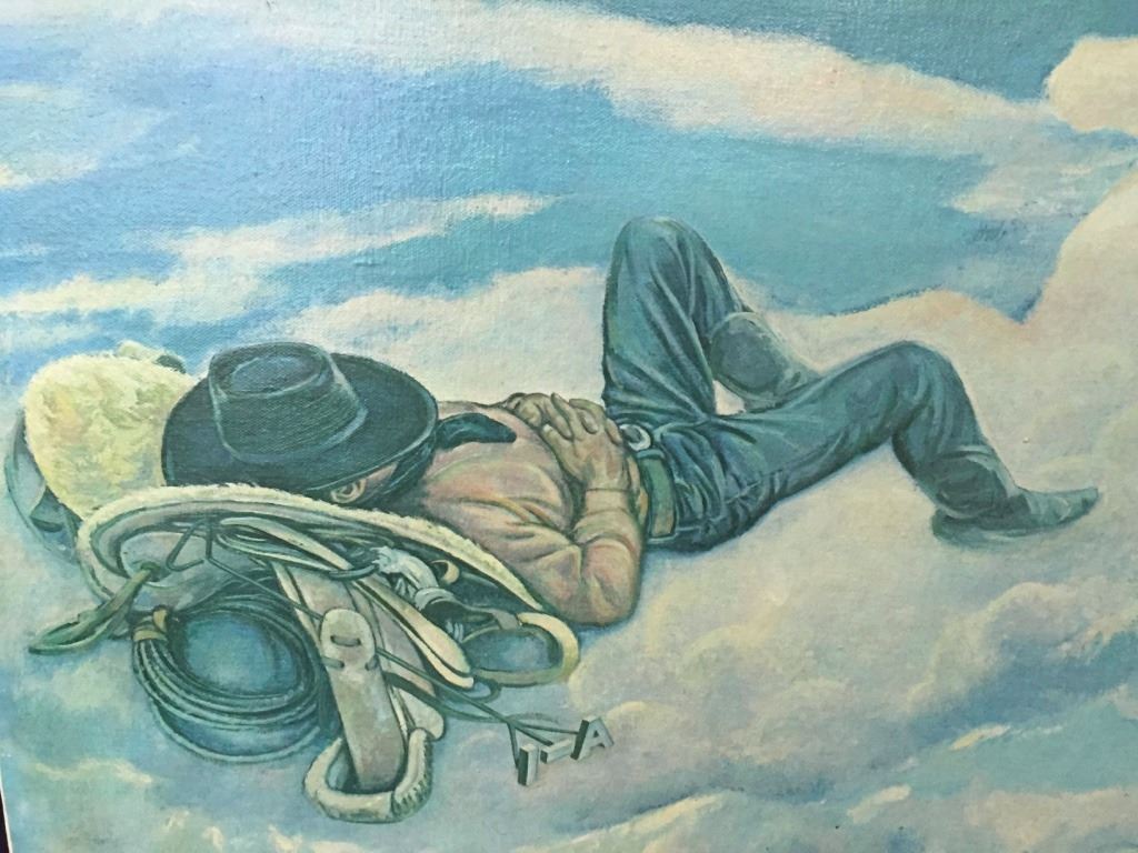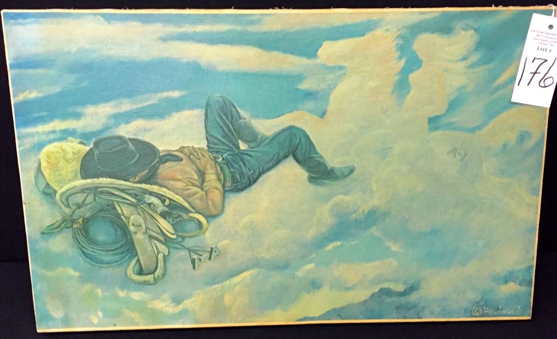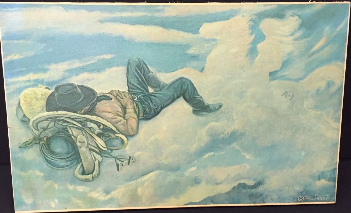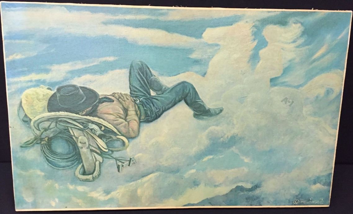 This is a vintage canvas transfer print of Lon’s famous “Cowboy Dreaming/A1 artwork.” It measures 26 inches wide by 16.25 inches high. Please look closely at pics - they are an important part of our description. Shipping: There will be a $10 handling / packaging fee for shipping this lot. The actual cost of postage will be added on top of that.