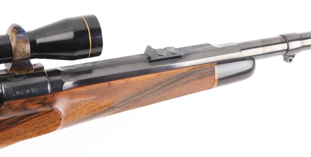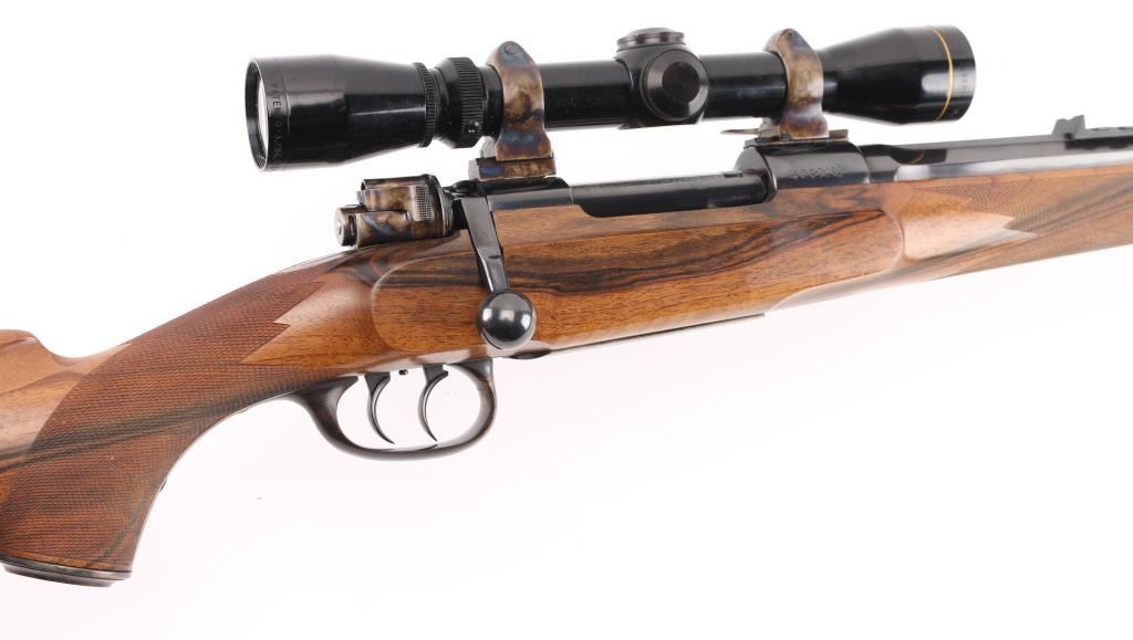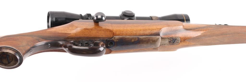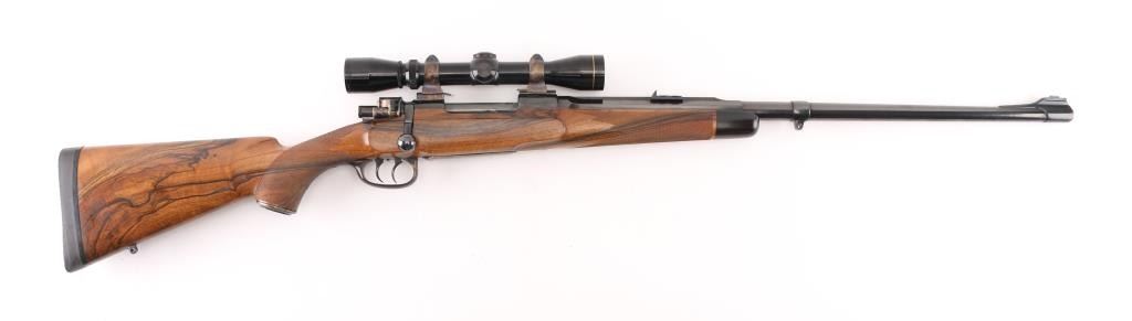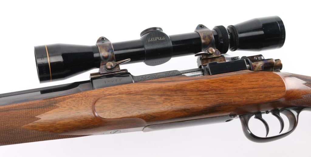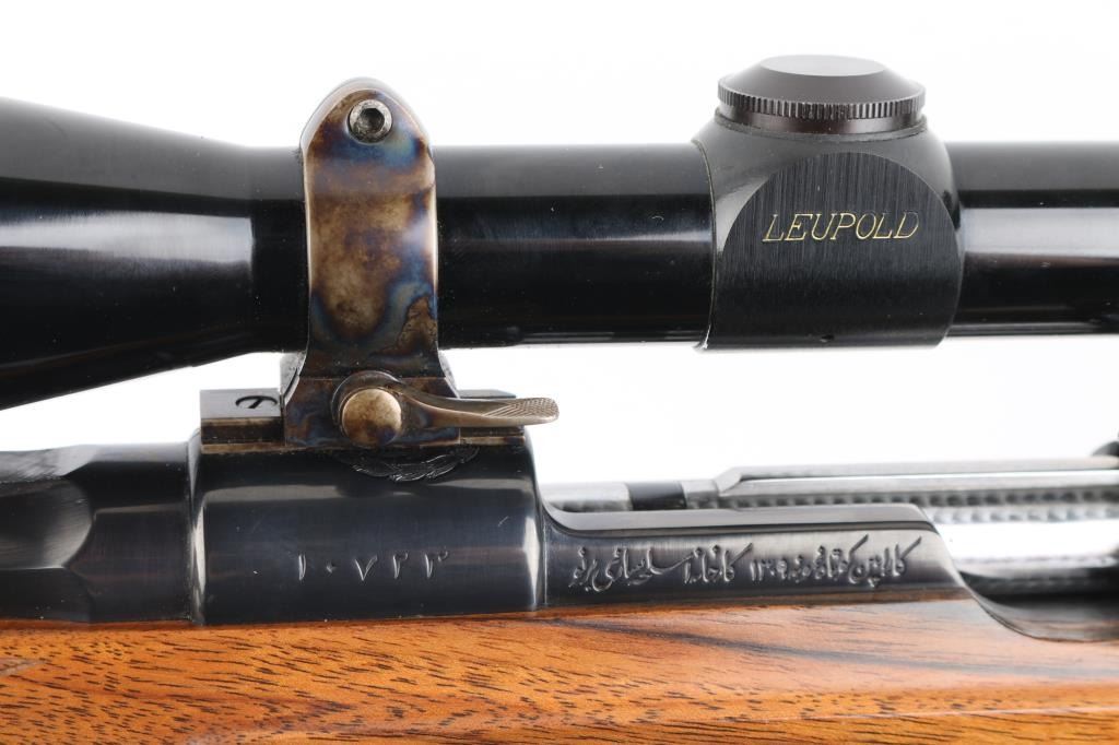 Lon Paul custom sporting rifle built on a Persian Model 98/29 Mauser receiver. Features a 23 1/4" Douglas premium Air Gauge special milled barrel, round/octagonal with ramped front blade with brass insert, v-notch rear with 2 folding leafs sights, recessed crown, banded sling swivel stud. Blue finish with case hardened floorplate, bolt sleeve, scope rings/bases & grip cap. Double set trigger with horn triggerguard, finely jeweled bolt with flat knurled underside of knob. Beautiful English walnut stock, highly figured with contrasting dark wood forearm tip, steel grip cap, fine point checkering on forearm & wrist, shadow line cheek piece, black solid Pachmayr recoil pad. Mounted with a Leupold 2x7 Vari-X IIc scope with fine crosshair reticle, clear optics. Bore is excellent, action is smooth/tight, wood & metal finishes are excellent. Comes with approx. 25 rounds of reloads. NRA Condition-Excellent+. C&R Firearm.