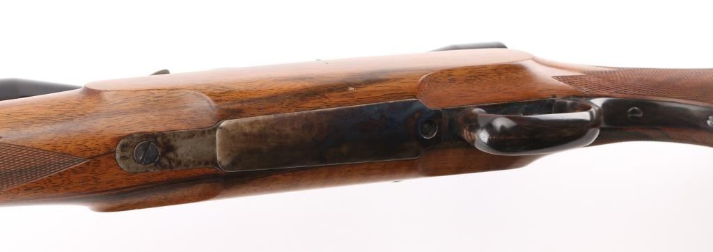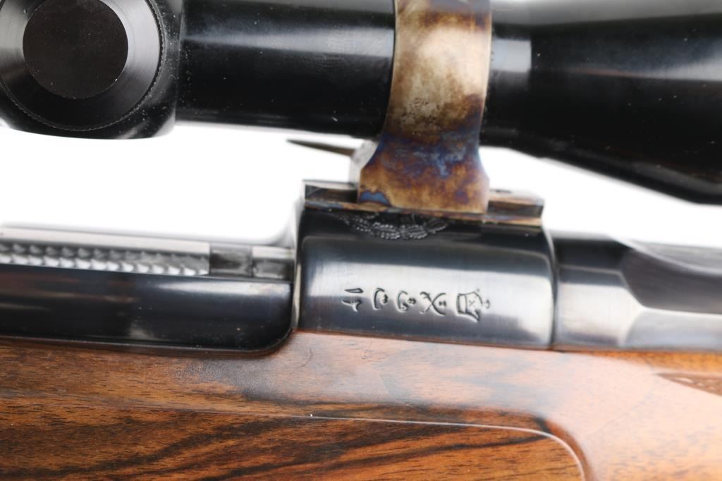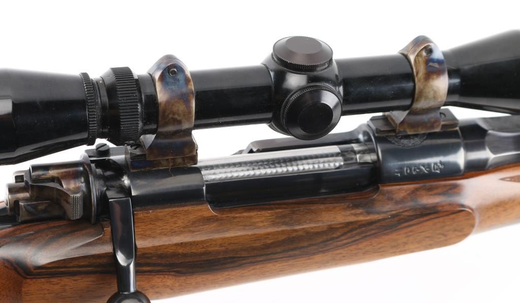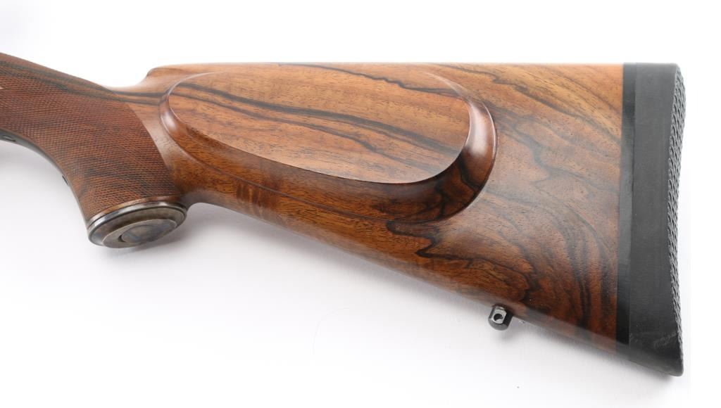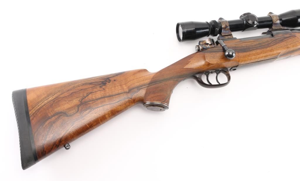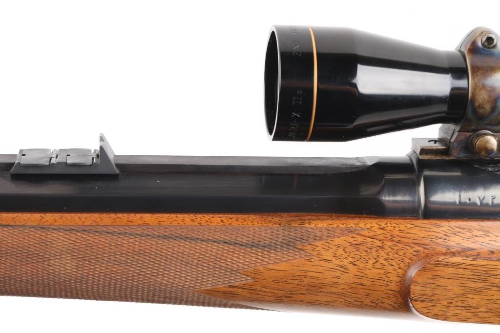 Lon Paul custom sporting rifle built on a Persian Model 98/29 Mauser receiver. Features a 23 1/4" Douglas premium Air Gauge special milled barrel, round/octagonal with ramped front blade with brass insert, v-notch rear with 2 folding leafs sights, recessed crown, banded sling swivel stud. Blue finish with case hardened floorplate, bolt sleeve, scope rings/bases & grip cap. Double set trigger with horn triggerguard, finely jeweled bolt with flat knurled underside of knob. Beautiful English walnut stock, highly figured with contrasting dark wood forearm tip, steel grip cap, fine point checkering on forearm & wrist, shadow line cheek piece, black solid Pachmayr recoil pad. Mounted with a Leupold 2x7 Vari-X IIc scope with fine crosshair reticle, clear optics. Bore is excellent, action is smooth/tight, wood & metal finishes are excellent. Comes with approx. 25 rounds of reloads. NRA Condition-Excellent+. C&R Firearm.