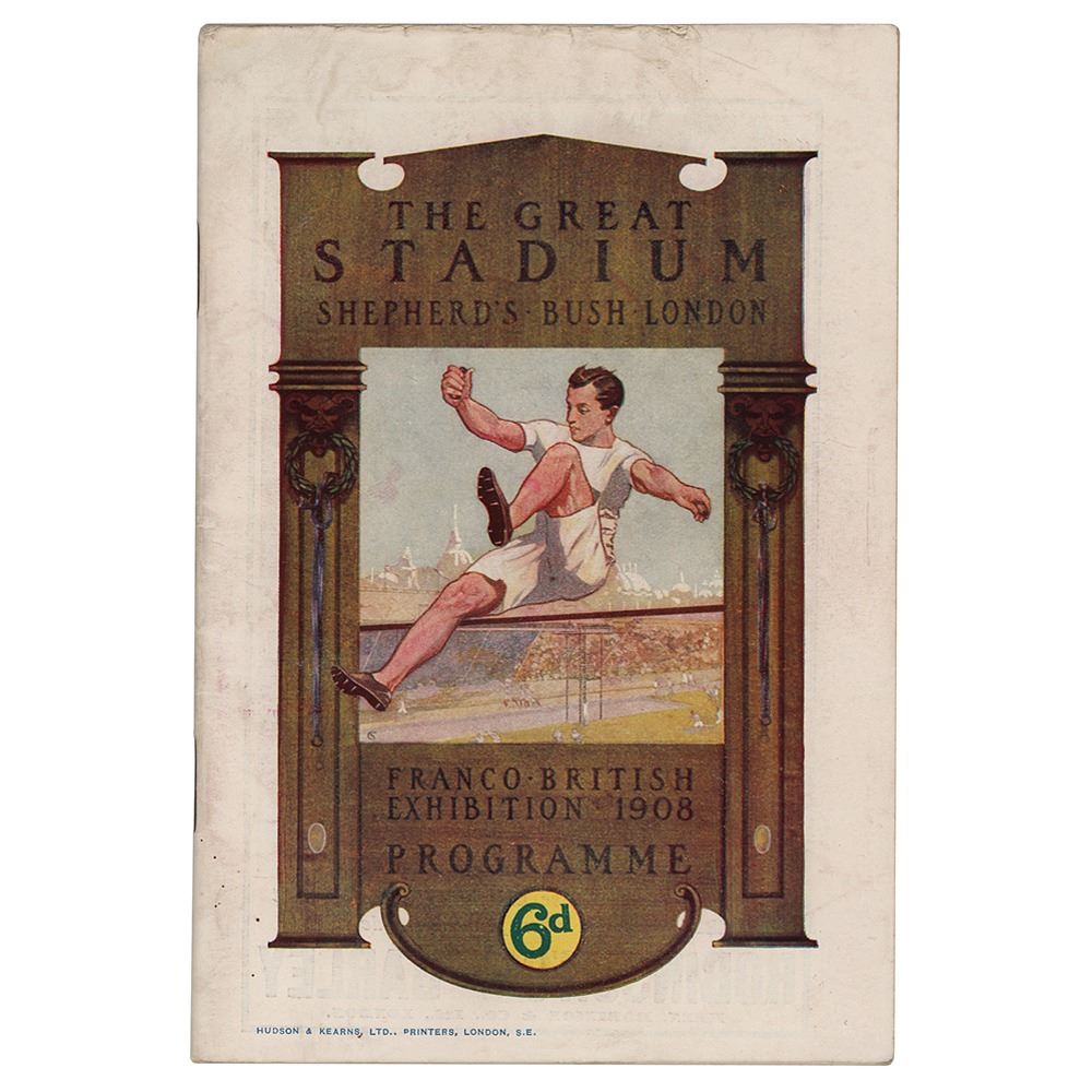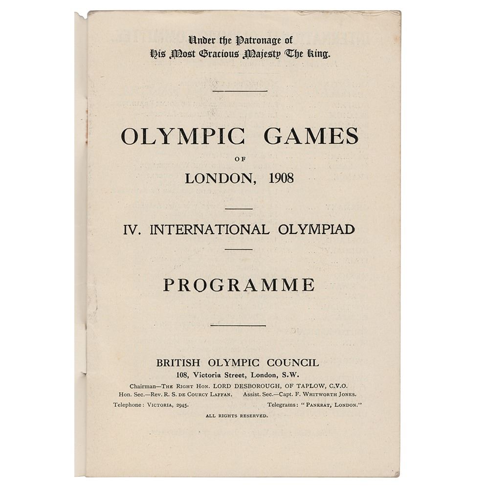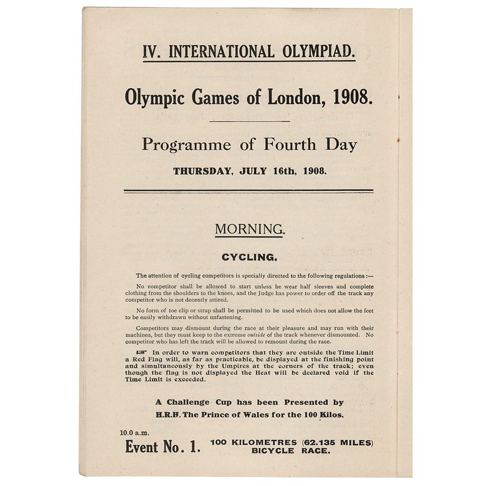 Program for the fourth day of the London 1908 Summer Olympics, July 16, 1908, 4.75 x 7.25, outlining the rules for the various competitions and listing the schedule of events for the day. Among the events listed are cycling (100-km bicycle race, 1000-meter bicycle race), the 10-mile walking race, freestyle discus, swimming (200-meter breaststroke, 400-meter final, 100-meter back stroke), gymnastics team competition, shot put, and fancy diving. In very good to fine condition, with edgewear to covers, and a bend to the upper right corner of covers and pages.