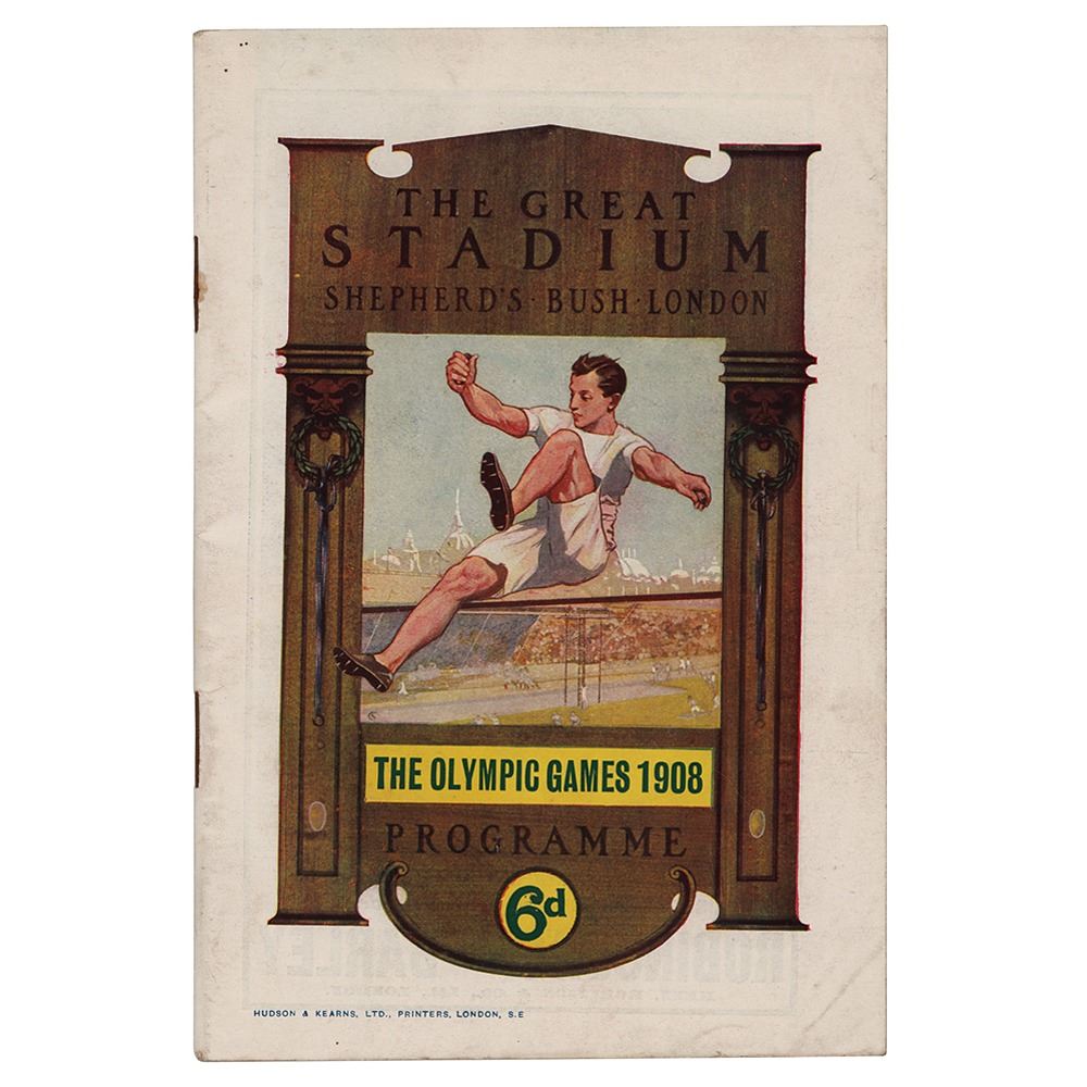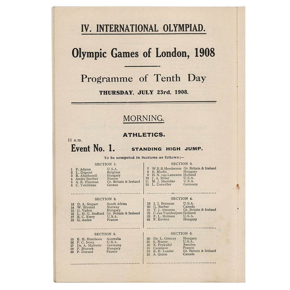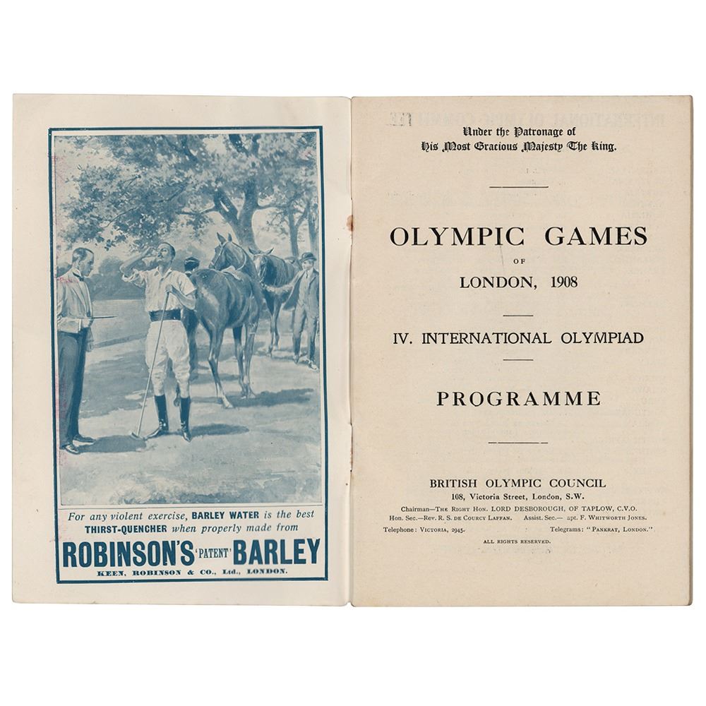 Program for the 10th day of the London 1908 Summer Olympics, July 23, 1908, 4.75 x 7.25, outlining the rules for the various competitions and listing the schedule of events for the day. Among the events listed are standing high jump, high diving, fencing, the 100-meter hurdle race, swimming 1,500-meter, 200-meter flat race, 400-meter flat race, 110-meter hurdle race, and Greco-Roman wrestling. In fine condition, with some light wear to covers, and some rusting to staples that affects the interior of pages on, and close to, the centerfold.