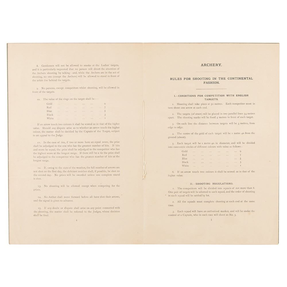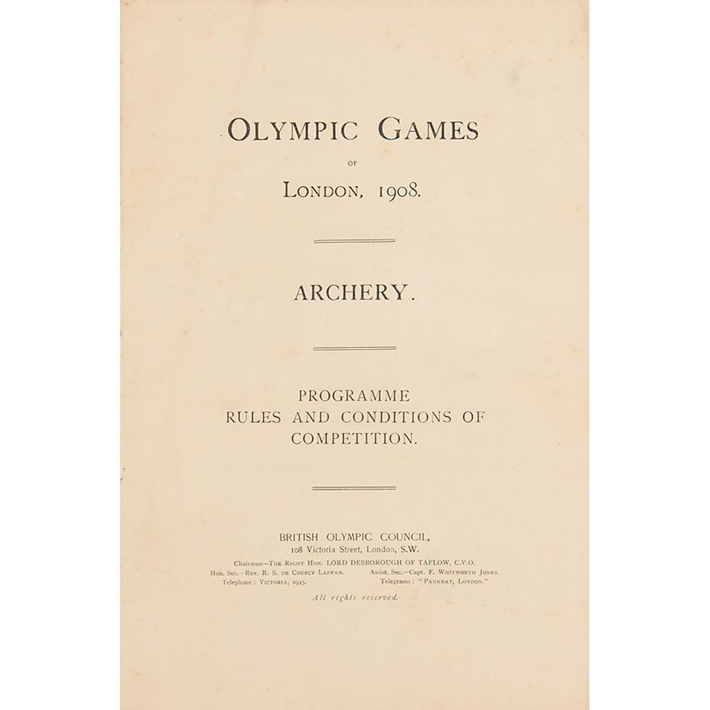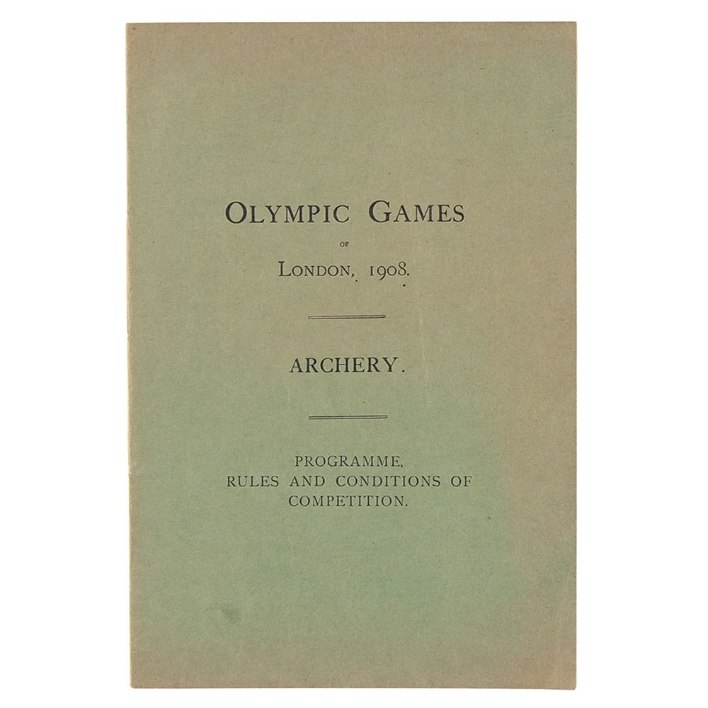 Original program, rules, and conditions of competition booklet for archery at the Olympic Games of London, 1908. Bound in paper wrappers, 6.5 x 9.75, six pages, printed for the British Olympic Council by Spottiswoode & Co. Ltd. of London. The English-language booklet outlines the rules, scoring system, and various regulations for the men's and women's archery competitions. In fine condition.