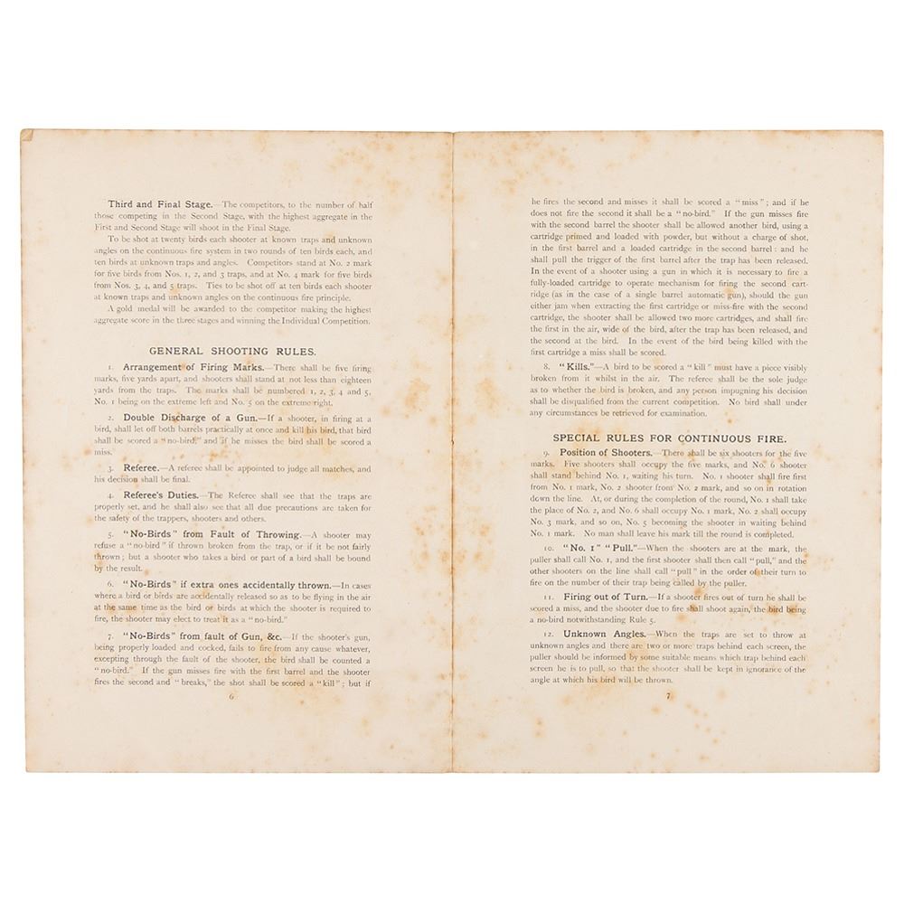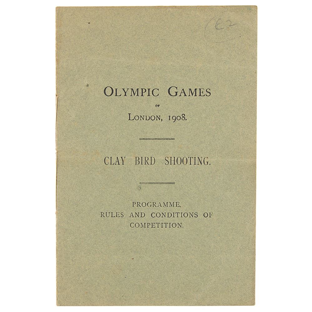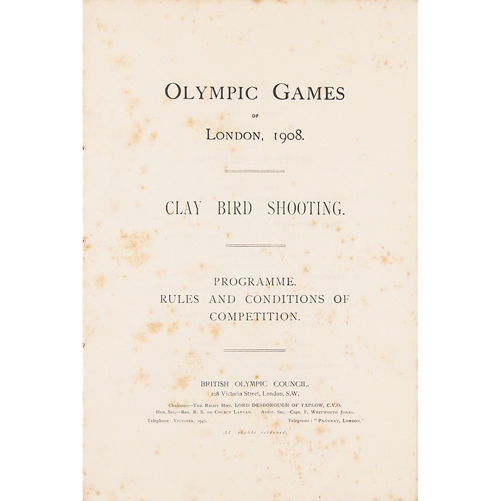Original program, rules, and conditions of competition booklet for clay pigeon shooting at the Olympic Games of London, 1908. Bound in paper wrappers, 6.5 x 9.75, eight pages, printed for the British Olympic Council by Spottiswoode & Co. Ltd. of London. The English-language booklet outlines the rules, stages of competition for individual and team events, and eligibility requirements for clay pigeon shooting. In very good condition, with light horizontal folds and heavy foxing to interior pages.