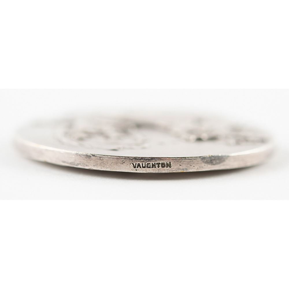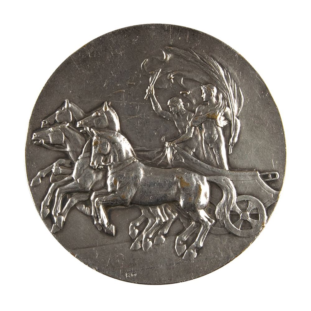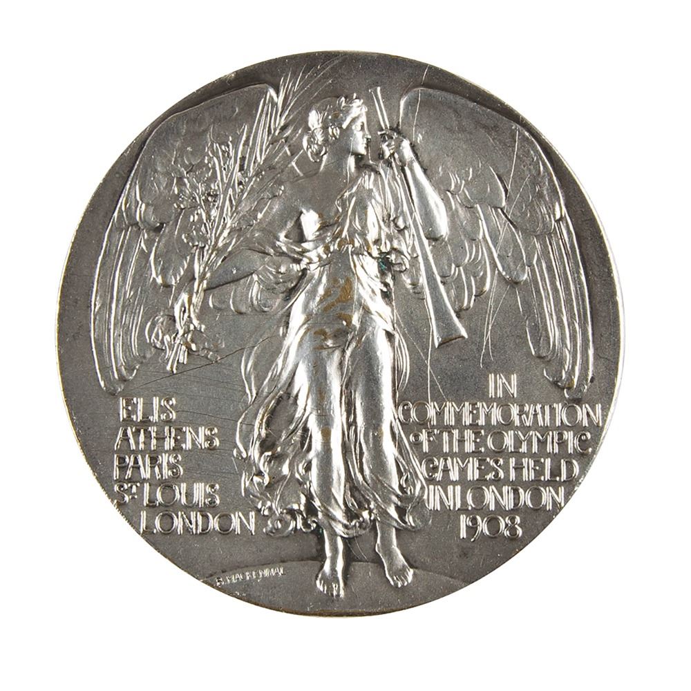 Participation medal issued for the London 1908 Summer Olympics. Silvered bronze, 51 mm, 60 gm, by Bertram Mackennal. The front depicts a quadriga with charioteer and judge, preparing to present the palm of victory; the reverse bears the winged figure of Fame standing on a globe with raised text on either side, "Elis, Athens, Paris, St. Louis, London" and "In Commemoration of the Olympic Games Held in London, 1908." Inscribed on the edge, "Vaughton." Presented to select officials and VIPs, this silver version of the medal is far scarcer than the pewter version given to athletes.