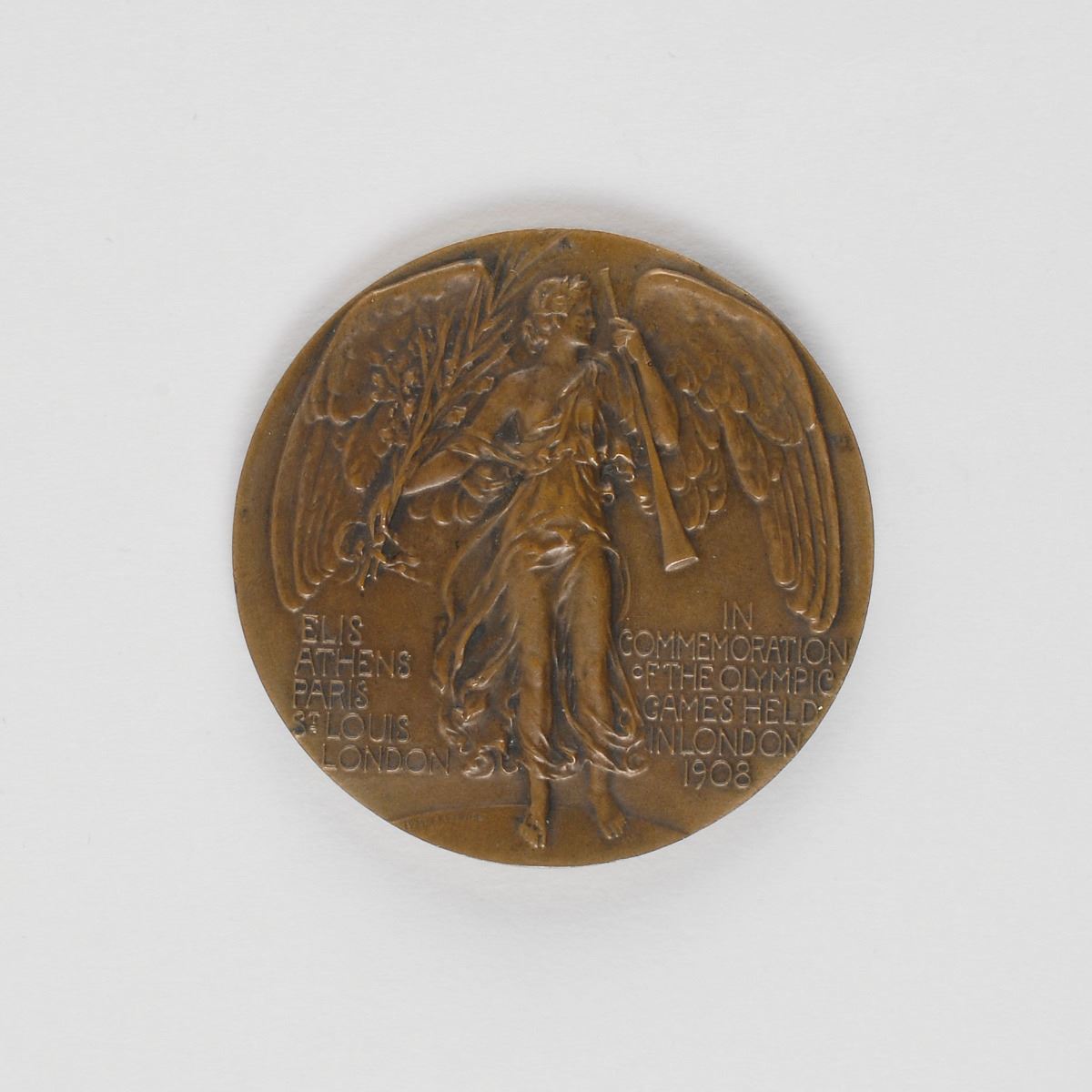 Participation medal issued for the London 1908 Summer Olympics. Bronze, 51 mm, 47 gm, by Bertram Mackennal. The front depicts a quadriga with charioteer and judge, preparing to present the palm of victory; the reverse bears the winged figure of Fame standing on a globe with raised text on either side, “Elis, Athens, Paris, St. Louis, London” and “In Commemoration of the Olympic Games Held in London, 1908.” Inscribed on the rim, “Vaughton.”
