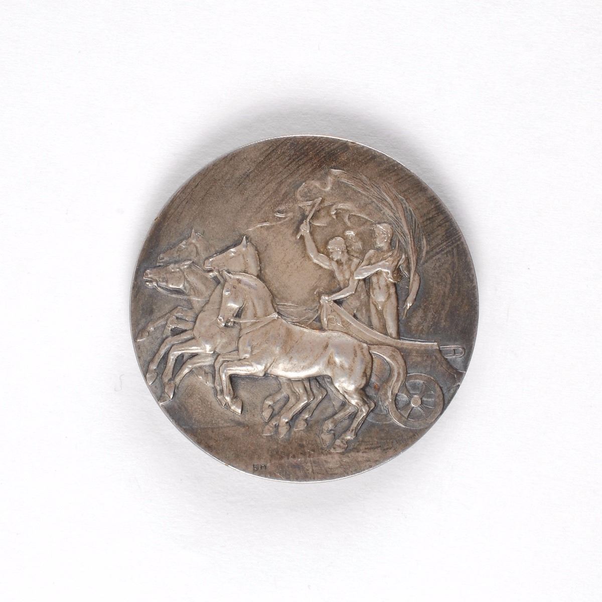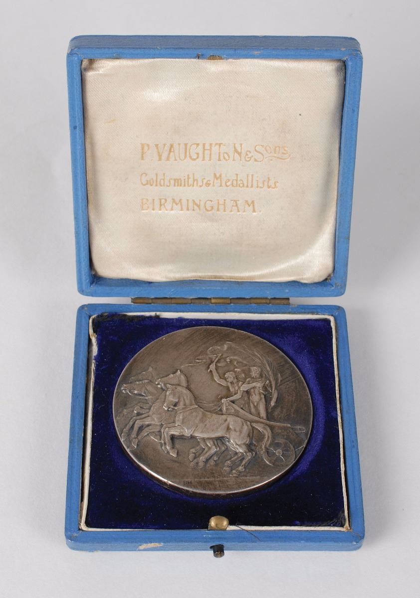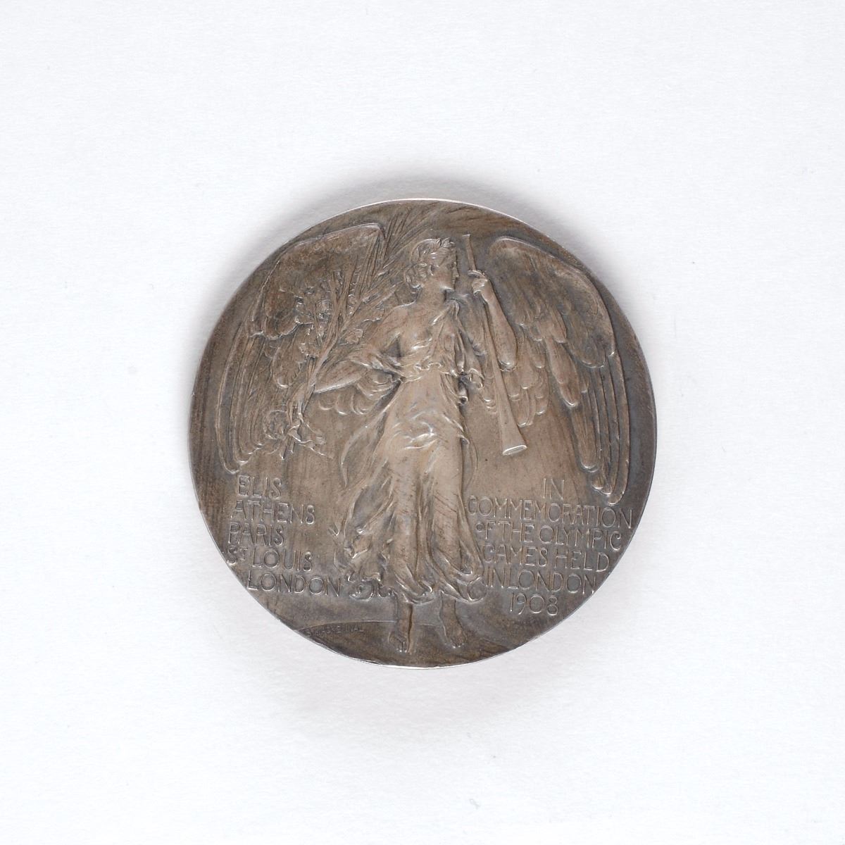 Participation medal issued for the London 1908 Summer Olympics. Silvered Bronze, 51 mm, 60 gm, by Bertram Mackennal. The front depicts a quadriga with charioteer and judge, preparing to present the palm of victory; the reverse bears the winged figure of Fame standing on a globe with raised text on either side, “Elis, Athens, Paris, St. Louis, London” and “In Commemoration of the Olympic Games Held in London, 1908.” Inscribed on the rim, “Vaughton.” Includes its original blue leather case, reading, “Olympic Games, Judge, London. 1908.”