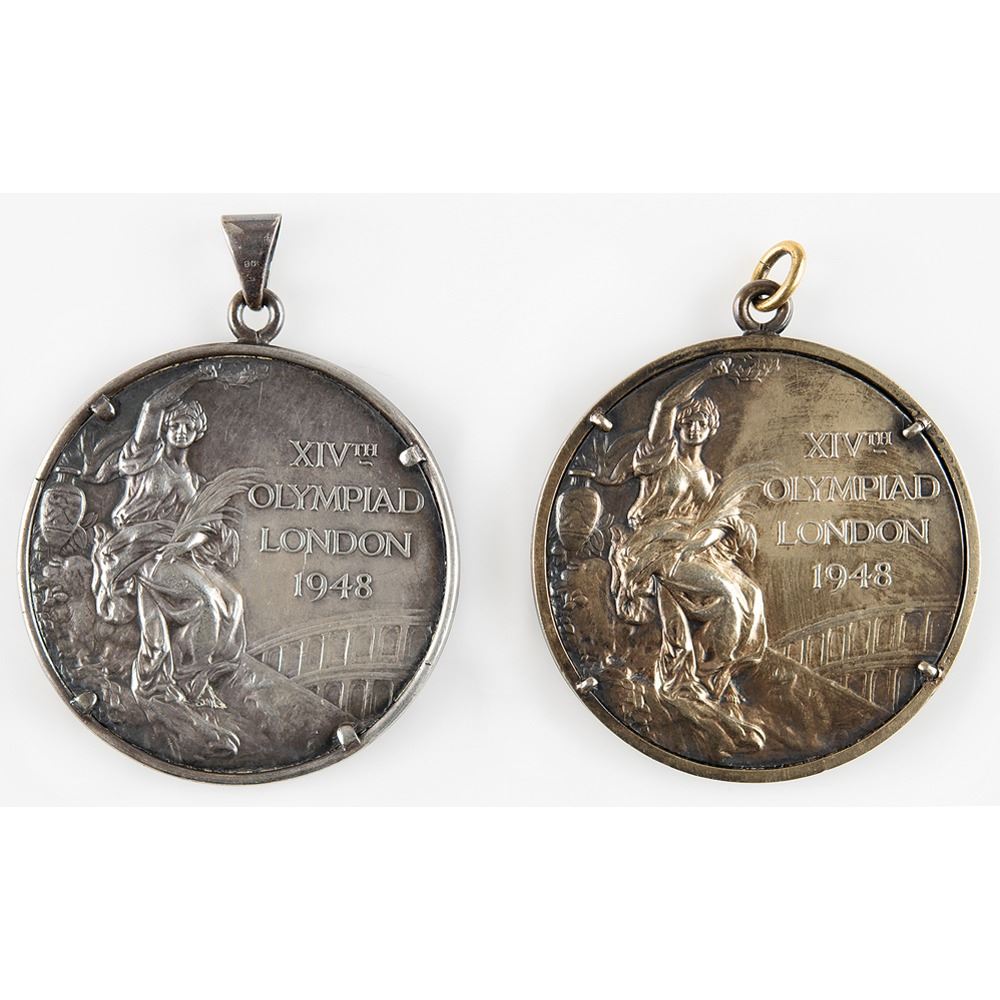 Tremendous pairing of gold and silver winner’s medals issued to legendary American swimmer Jimmy McLane at the London 1948 Summer Olympics. As a 17-year-old underclassman at the Phillips Academy prep school in Andover, Massachusetts, McLane took home three winner’s medals from the historic XIV Olympiad—a silver in the 400-meter freestyle, and golds in the 1500-meter freestyle and the 4 x 200-meter freestyle relay; it remains unknown to which event the offered gold medal belongs.