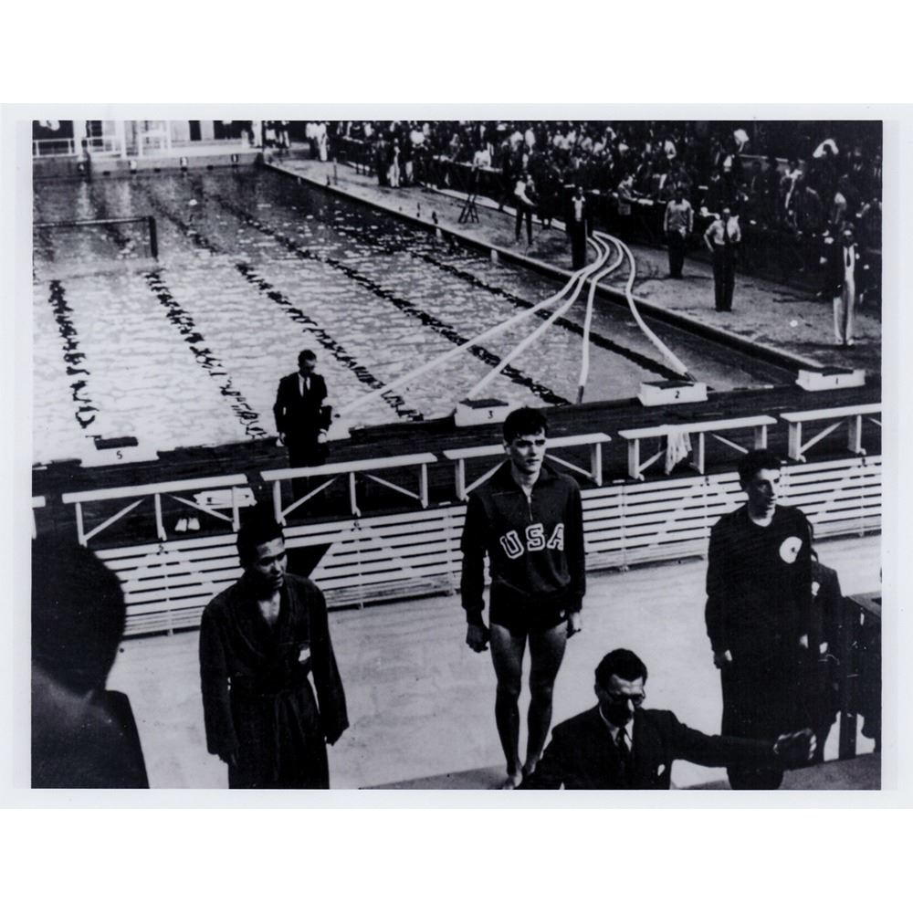 Also included is a bronze participation medal issued for the London 1948 Summer Olympics, and a bronze United States Olympic Committee commemorative medal. Accompanied by a photo of McLane standing triumphant on the winner’s podium.
