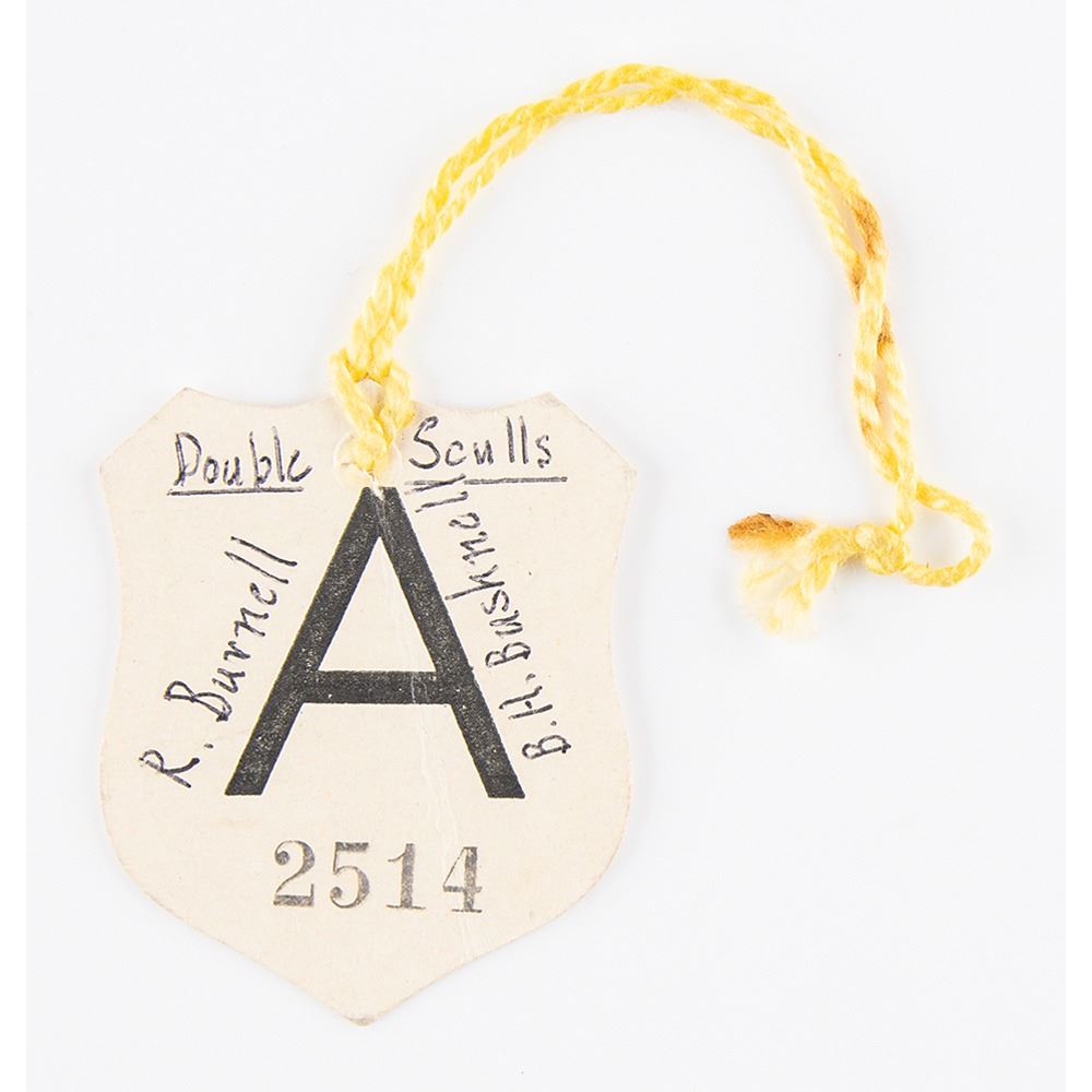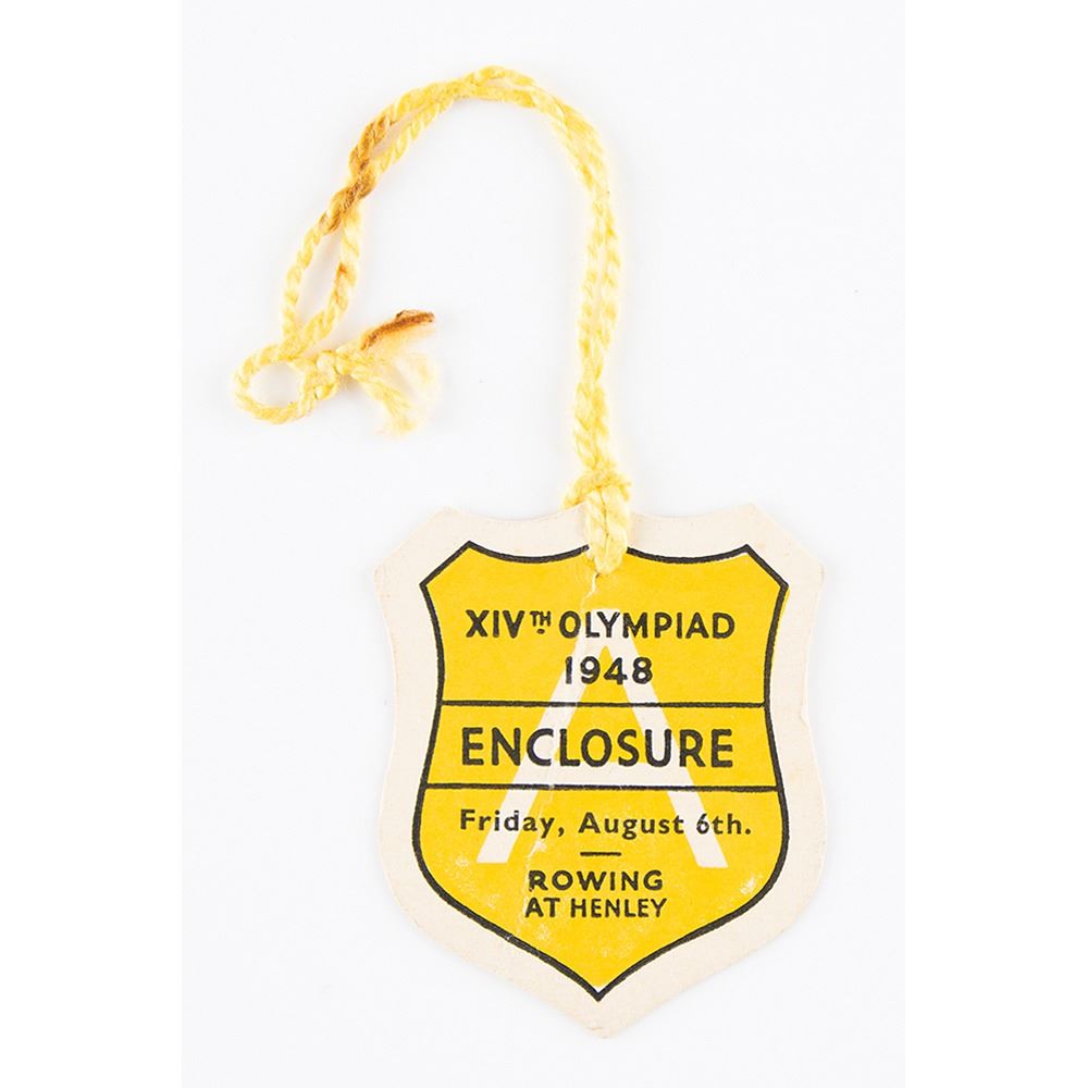 Cardstock admission badge for the rowing enclosure at the 1948 London Summer Olympics, 1.75 x 2, imprinted: "XIVth Olympiad, 1948, Enclosure, Friday, August 6th, Rowing at Henley." Reverse reads, "A 2514," and is annotated in ballpoint: "Double Sculls, R. Burnell, B. H. Bushnell." Dickie Burnell and Bert Bushnell took gold in the double sculls competition held at the Leander Club in Henley-on-Thames on August 9th.