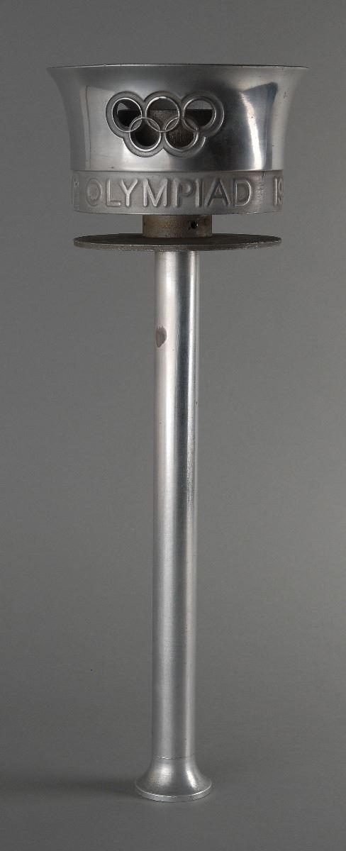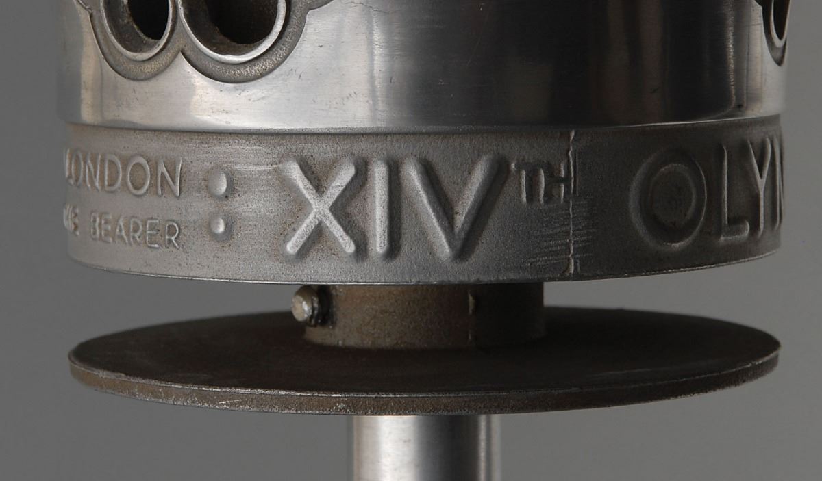 Sought-after official 1948 London Olympics torch, comprised of aluminum alloy, measuring 16? in length and 5.75? at its widest point, designed by Ralph Lavers. The upper part is designed in the shape of a cauldron with three ‘cut-outs’ of the Olympic rings, encircled below by the inscription, “Olympia to London, with thanks to the bearer: XIVth Olympiad 1948.” The Olympic flame was lit in Olympia, Greece, on July 17, 1948, and traveled a total of 3,365 km before reaching the opening ceremony at Wembley Stadium on July 29. The 1948 Olympics in London represented the first Summer Games since 1936 after a twelve-year hiatus due to World War II. The total number of torches manufactured was 1,688. A classically designed torch from the second ever Olympic torch relay.