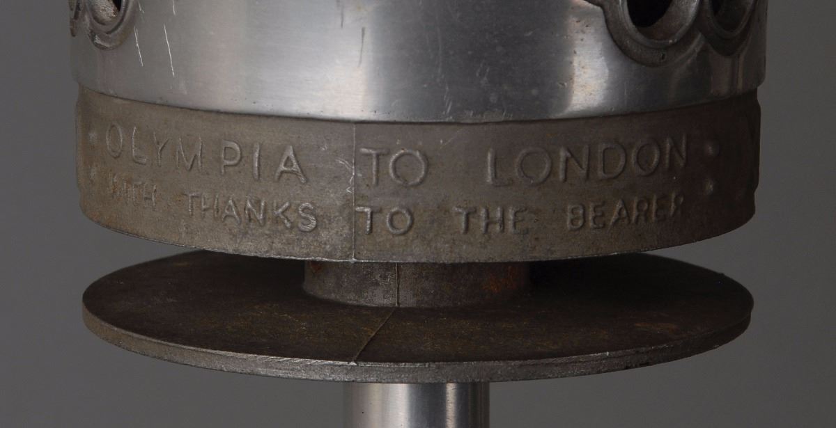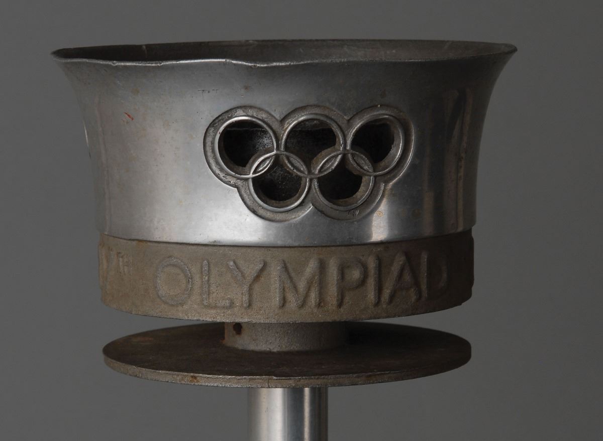 Sought-after official 1948 London Olympics torch, comprised of aluminum alloy, measuring 16? in length and 5? at its widest point, designed by Ralph Lavers. The upper part is designed in the shape of a cauldron with three ‘cut-outs’ of the Olympic rings, encircled below by the inscription, “Olympia to London, with thanks to the bearer: XIVth Olympiad 1948.” The 1948 Olympics in London represented the first Summer Games since 1936 after a twelve-year hiatus due to World War II. The total number of torches manufactured was 1,688.