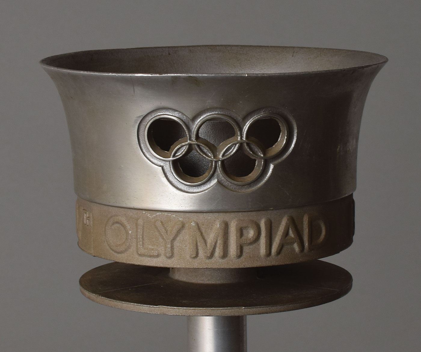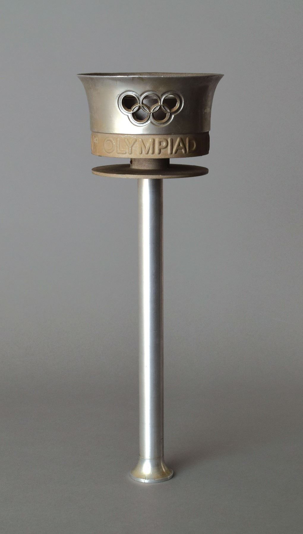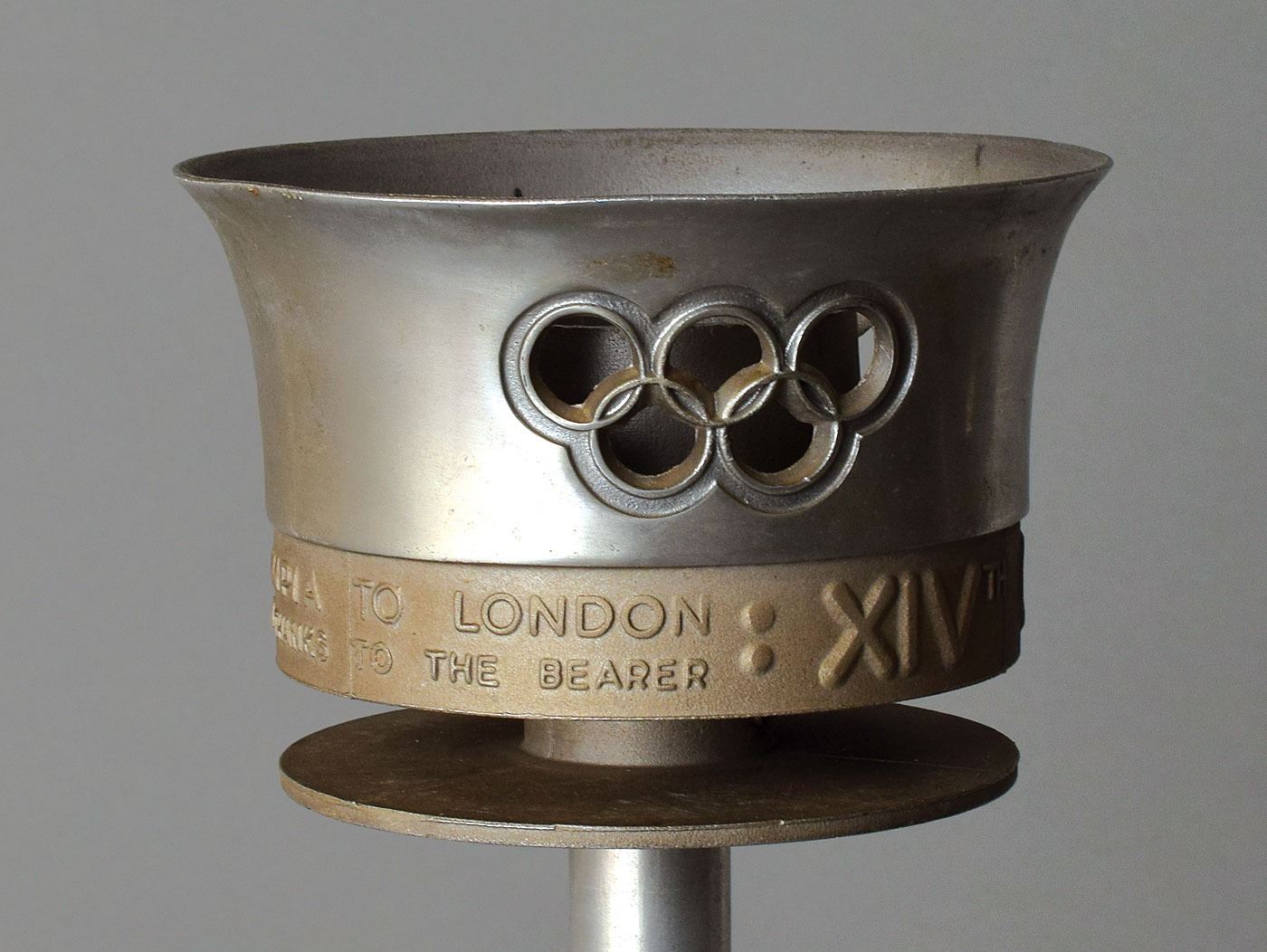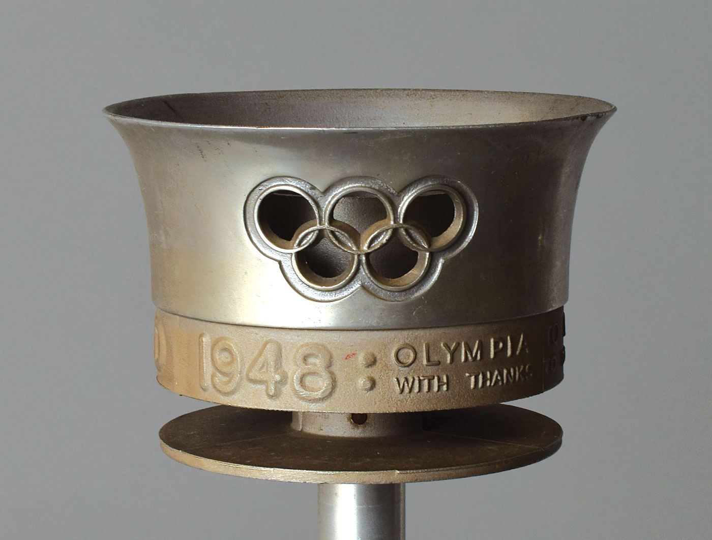 Sought-after official 1948 London Olympics torch, comprised of aluminum alloy, measuring 16? in length and 5.75? at its widest point, designed by Ralph Lavers. The upper part is designed in the shape of a cauldron with three 'cut-outs' of the Olympic rings, encircled below by the inscription, "Olympia to London, with thanks to the bearer: XIVth Olympiad 1948." The Olympic flame was lit in Olympia, Greece, on July 17, 1948, and traveled a total of 3,365 km before reaching the opening ceremony at Wembley Stadium on July 29. The 1948 Olympics in London represented the first Summer Games since 1936 after a twelve-year hiatus due to World War II. The total number of torches manufactured was 1,688. A classically designed torch from the second ever Olympic torch relay.