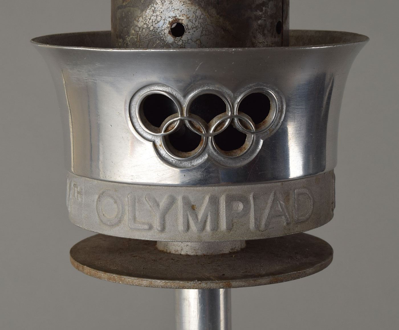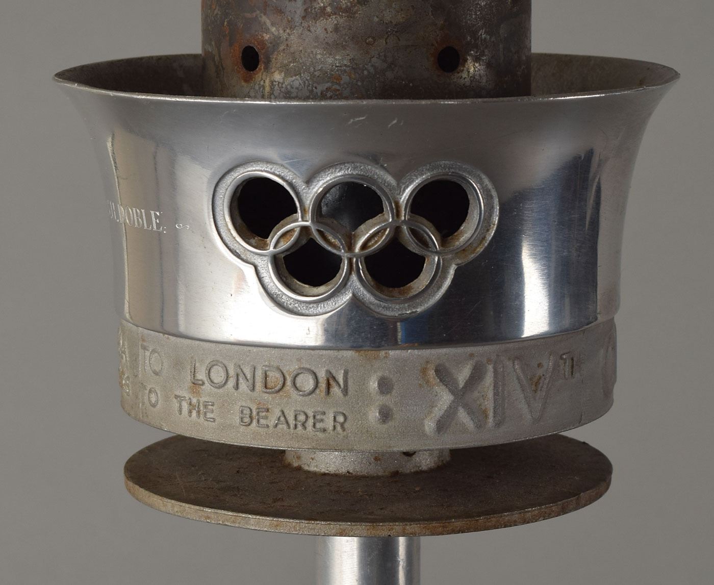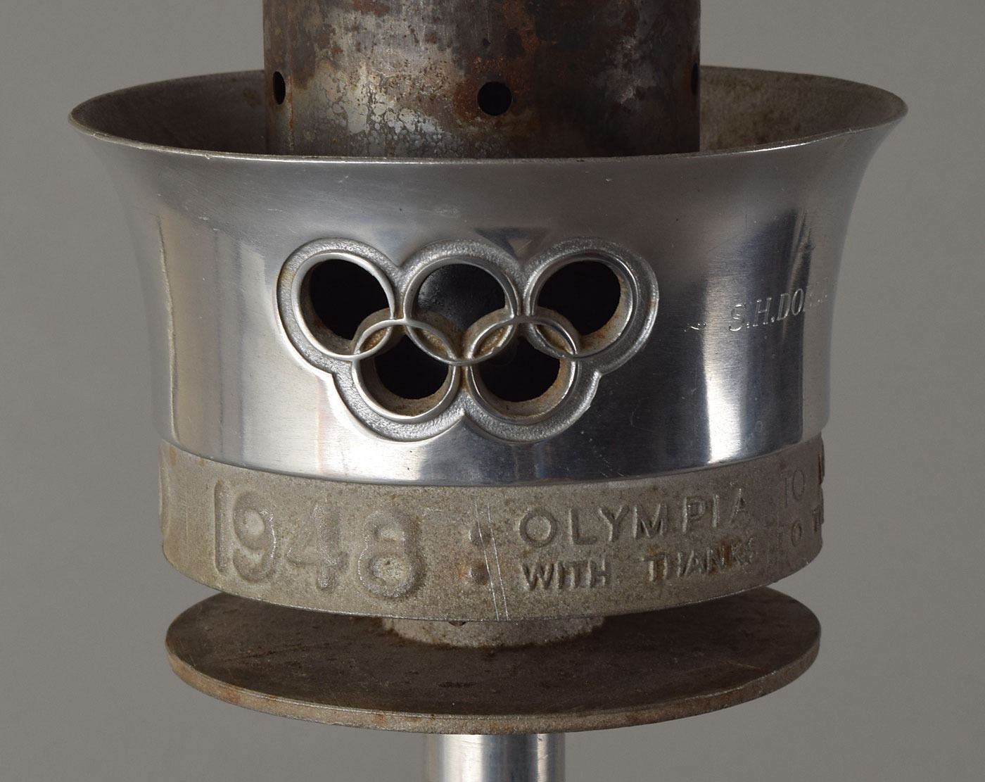 Sought-after official 1948 London Olympics torch, comprised of aluminum alloy, measuring 16? in length and 5.75? at its widest point, designed by Ralph Lavers. The upper part is designed in the shape of a cauldron with three 'cut-outs' of the Olympic rings, encircled below by the inscription, "Olympia to London, with thanks to the bearer: XIVth Olympiad 1948." Complete with its rare steel burner cylinder, which is rusted through on the top. The Olympic flame was lit in Olympia, Greece, on July 17, 1948, and traveled a total of 3,365 km before reaching the opening ceremony at Wembley Stadium on July 29. The 1948 Olympics in London represented the first Summer Games since 1936 after a twelve-year hiatus due to World War II. The total number of torches manufactured was 1,688. A classically designed torch from the second ever Olympic torch relay.