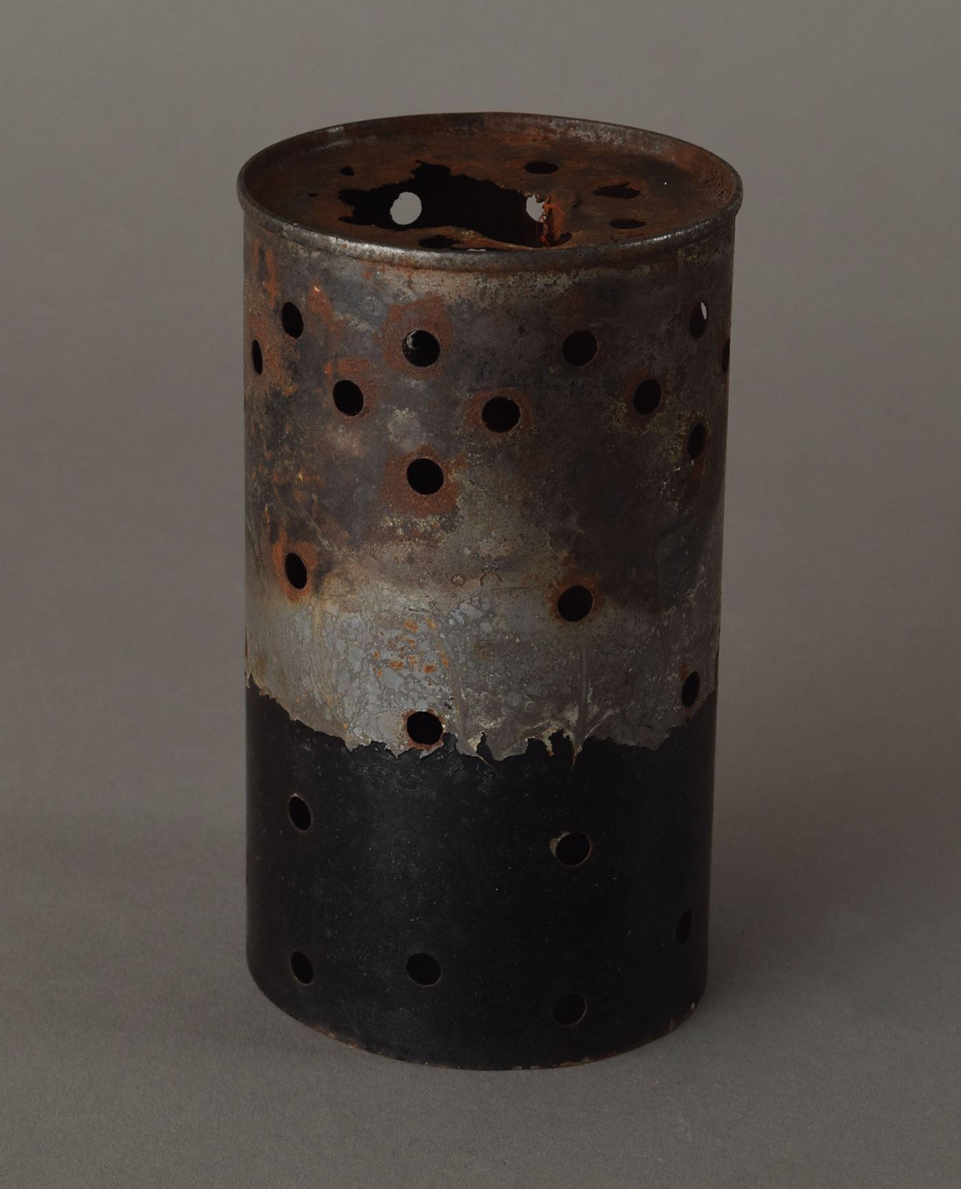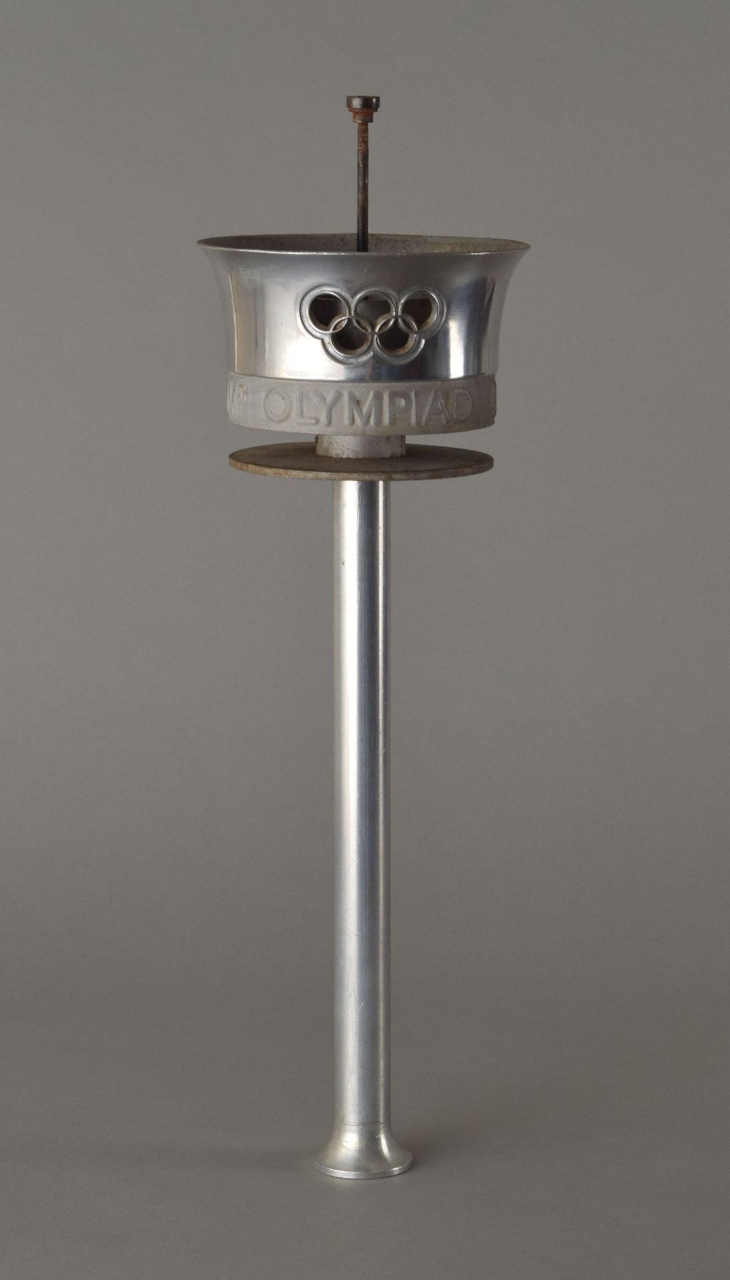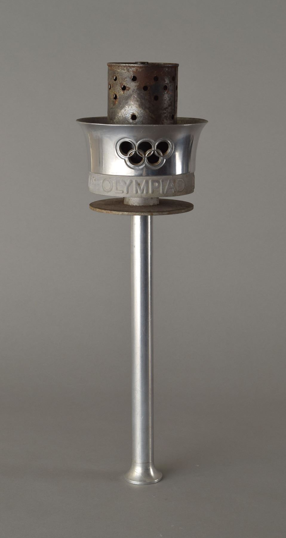 Sought-after official 1948 London Olympics torch, comprised of aluminum alloy, measuring 16? in length and 5.75? at its widest point, designed by Ralph Lavers. The upper part is designed in the shape of a cauldron with three 'cut-outs' of the Olympic rings, encircled below by the inscription, "Olympia to London, with thanks to the bearer: XIVth Olympiad 1948." Complete with its rare steel burner cylinder, which is rusted through on the top. The Olympic flame was lit in Olympia, Greece, on July 17, 1948, and traveled a total of 3,365 km before reaching the opening ceremony at Wembley Stadium on July 29. The 1948 Olympics in London represented the first Summer Games since 1936 after a twelve-year hiatus due to World War II. The total number of torches manufactured was 1,688. A classically designed torch from the second ever Olympic torch relay.