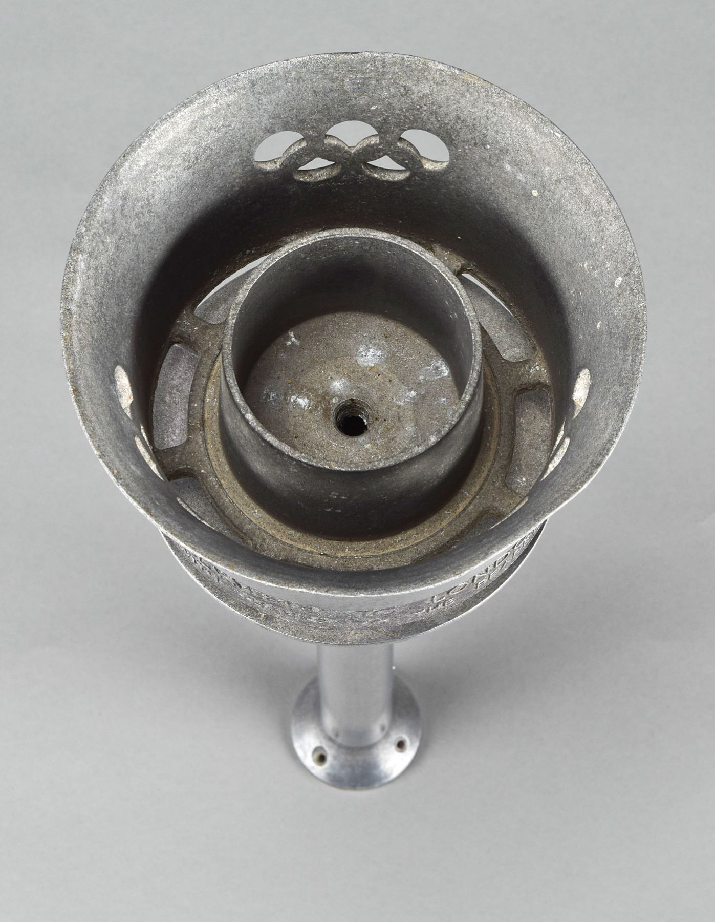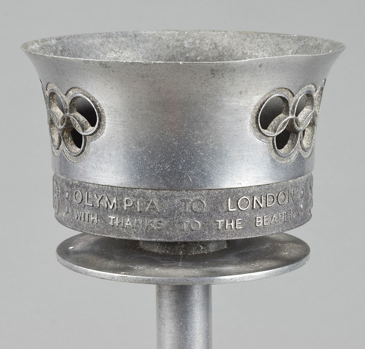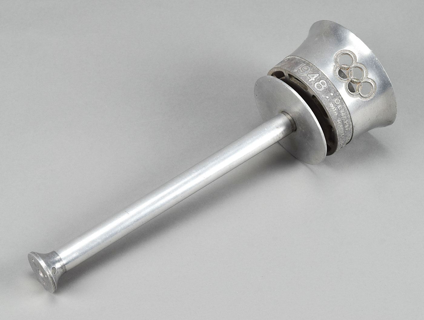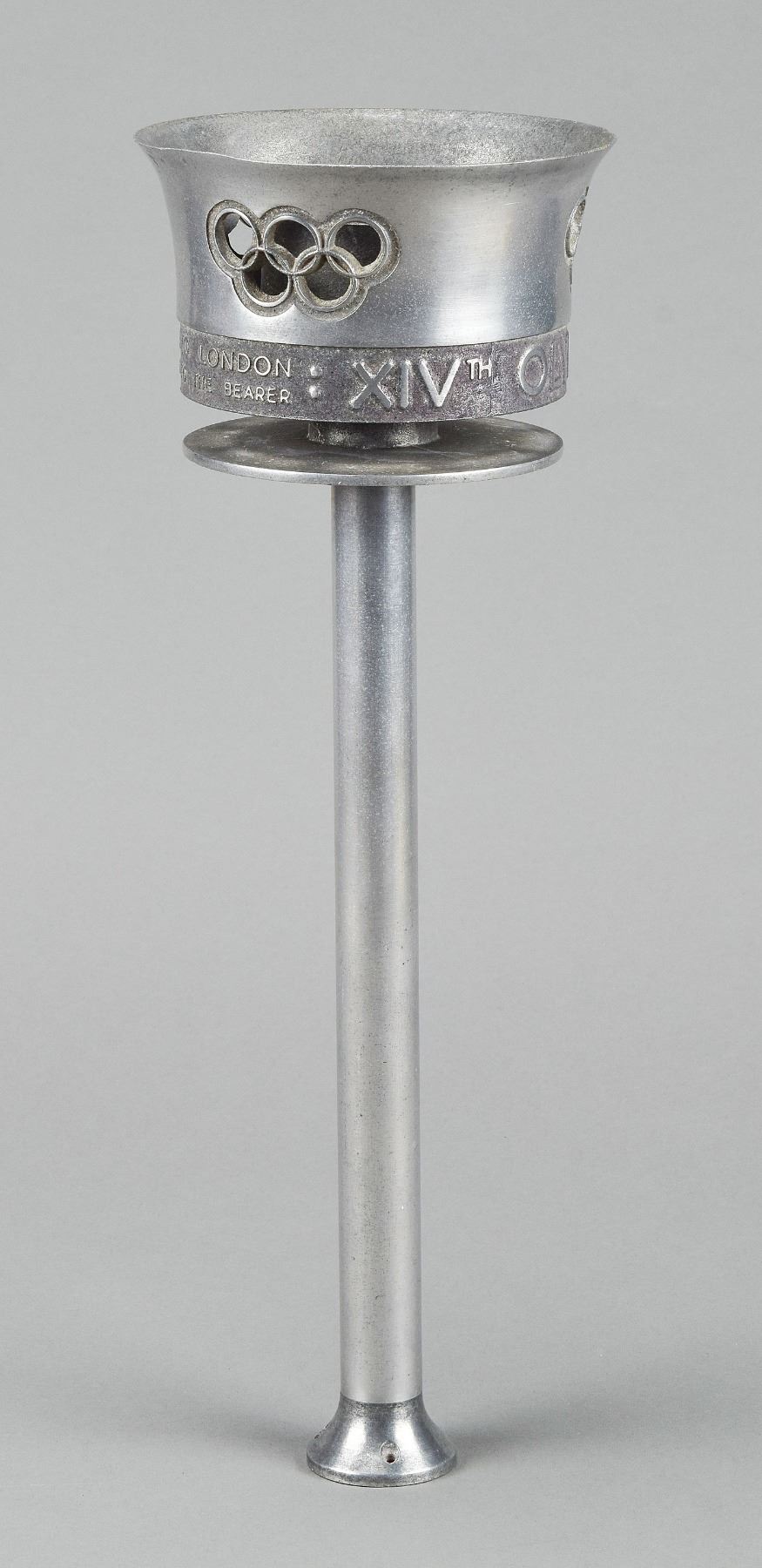 Sought-after official 1948 London Olympics torch, comprised of aluminum alloy, measuring 16? in length and 5? at its widest point, designed by Ralph Lavers. The upper part is designed in the shape of a cauldron with three 'cut-outs' of the Olympic rings, encircled below by the inscription, "Olympia to London, with thanks to the bearer: XIVth Olympiad 1948." The Olympic flame was lit in Olympia, Greece, on July 17, 1948, and traveled a total of 3,365 km before reaching the opening ceremony at Wembley Stadium on July 29. The 1948 Olympics in London represented the first Summer Games since 1936 after a twelve-year hiatus due to World War II. The total number of torches manufactured was 1,688. A classically designed torch from the second ever Olympic torch relay.