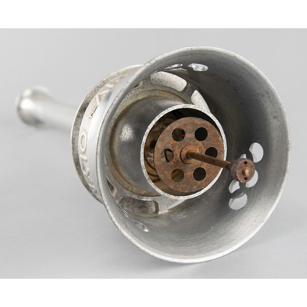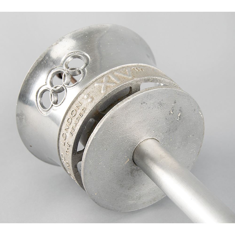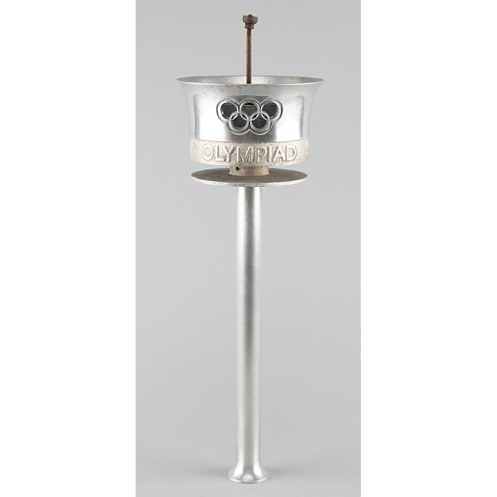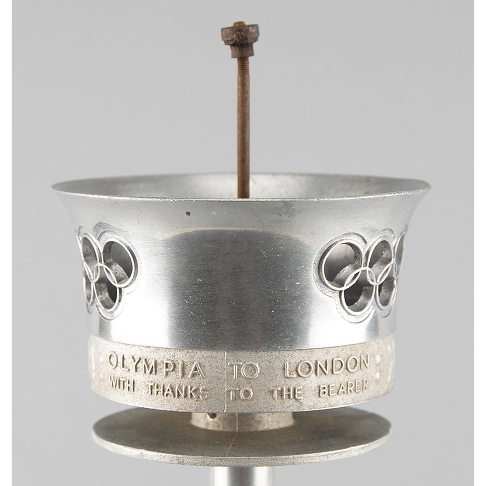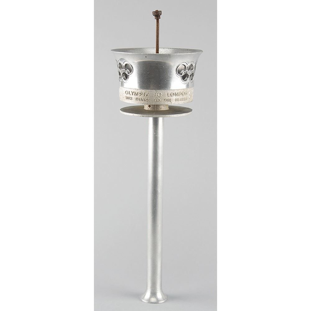 Historic official 1948 London Olympics torch, comprised of aluminum alloy, measuring 16Ë in length and 5.75Ë at its widest point, designed by Ralph Lavers. The upper part is designed in the shape of a cauldron with three 'cut-outs' of the Olympic rings, encircled below by the inscription, "Olympia to London, with thanks to the bearer: XIVth Olympiad 1948." Present to the burner is a scarce rod and spring-action section that bears overall rusting; other areas of the torch feature trivial scuffs or dings. The Olympic flame was lit in Olympia, Greece, on July 17, 1948, and traveled a total of 3,365 km before reaching the opening ceremony at Wembley Stadium on July 29. The 1948 Olympics in London represented the first Summer Games since 1936 after a twelve-year hiatus due to World War II. The total number of torches manufactured was 1,688. A sought-after, classically designed torch from the second-ever Olympic torch relay.