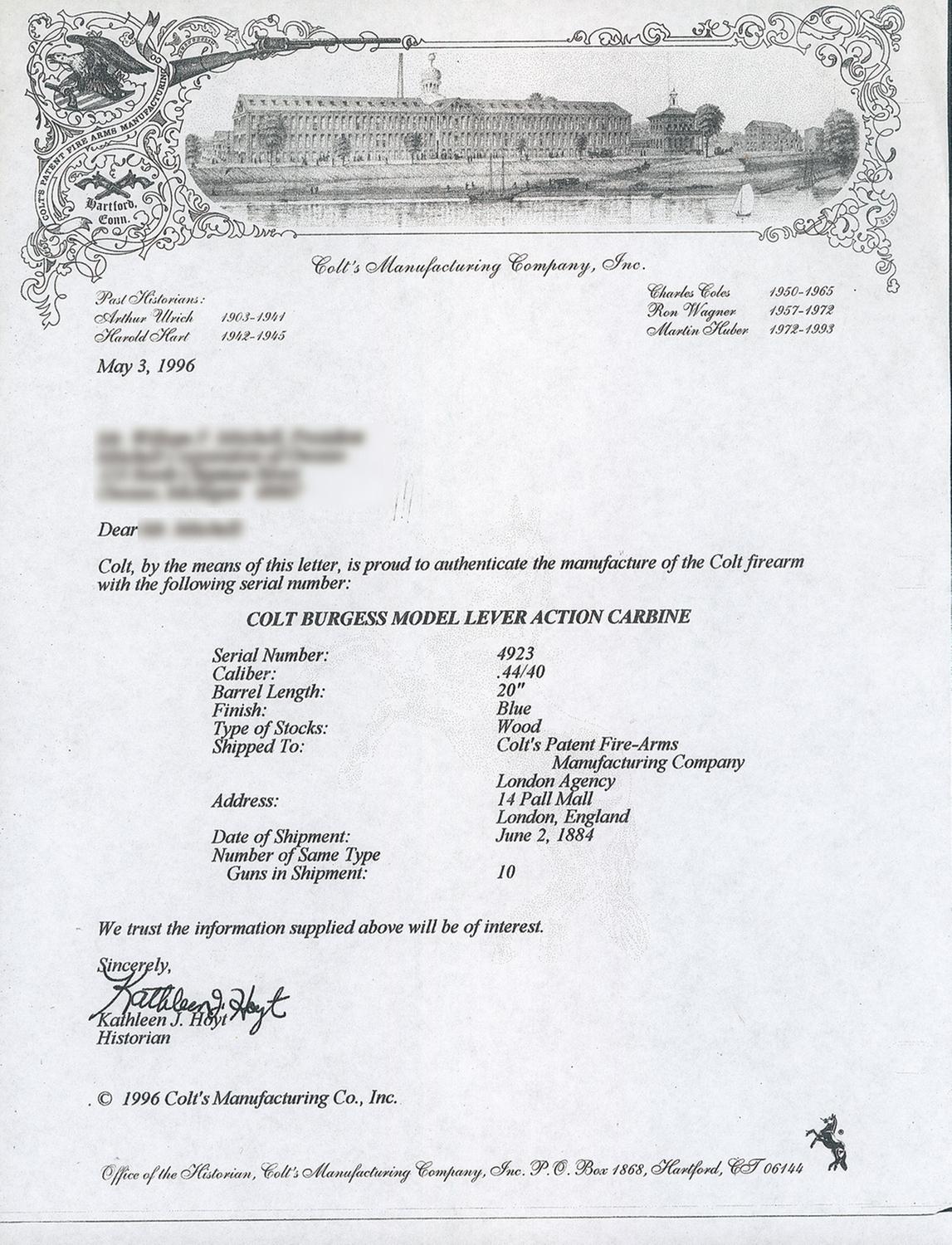 The included Colt factory letter confirms the serial number, barrel length, and caliber, with the finish listed as blue and type of stocks listed as "wood". The letter states that the carbine with shipped to Colt's Patent Fire-Arms Manufacturing Company, London Agency, London, England, on June 2, 1884 as part of a 10 gun shipment. The carbine has the two line Colt Hartford address/patent marking on the barrel, the Rampant Colt on the receiver, and "BURGESS'S PATENTS" on the casehardened lever. Saddle ring stud with ring mount on the left side of the receiver. Checkered deluxe forearm and straight grip stock with casehardened buttplate and leather sling.