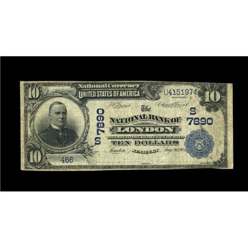 <B>London, KY</B></I> - $10 1902 Date Back Fr. 617 <B>The NB of London</B></I> Ch. # (S)7890<BR>After a momentary blip, this collection now gets back on track by offering two of the four reported large examples from this London bank. It is unlikely we will see many more, as this bank had just $790 outstanding in large notes by 1935. <B>Fine.</B></I>