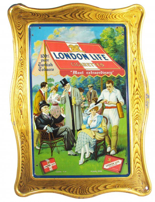 London Life Cigarettes Self Framed Tin Sign. Paint loss mostly to edge of frame, some scratches, and dent at bottom left otherwise good condition. 28 X 39 inches.