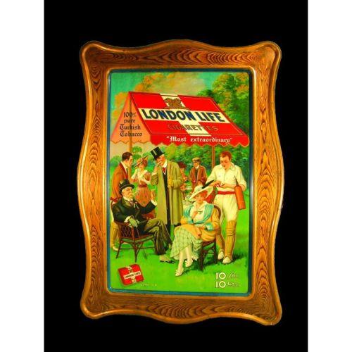 London Life Cigarettes Self-Framed Tin Sign, minor scratches mostly on the border otherwise excellent condition, 28 x 39 inches.