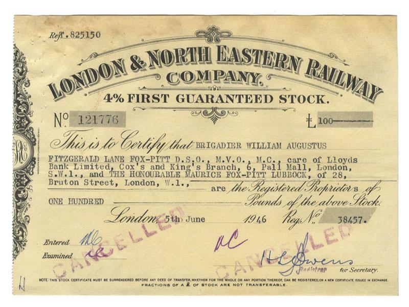1946, London, England. Four Per Cent First Guaranteed Stock certificate for 522 Pounds. Yellow. Issued to “Brigadier William Augustus Fitzgerald Fox-Pitt…” Brigadier William Augustus Fitzgerald Fox-Pitt (1896 – 1988). Major General. Stamp cancelled and Fine.