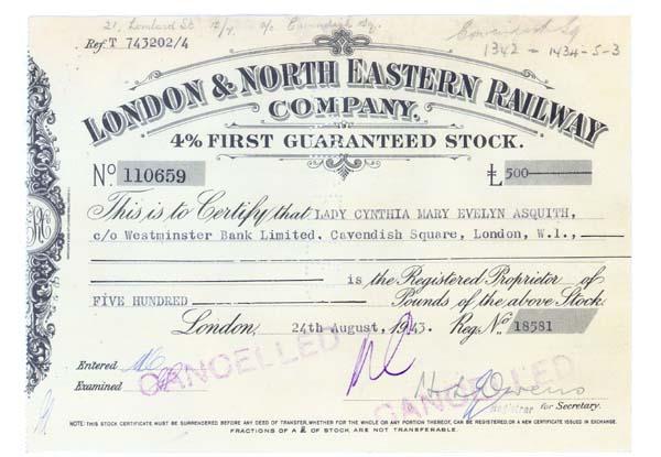 1943, London, England. 4% First Guaranteed Stock certificate for 500 Pounds. Black on Yellow paper. Litho. Issued to though not signed by Lady Cynthia Mary Evelyn Asquith (1887 – 1960). English writer best known for her ghost stories and diaries. Interesting to see this author on a stock certificate. Lightly Stamp and Punch cancelled.