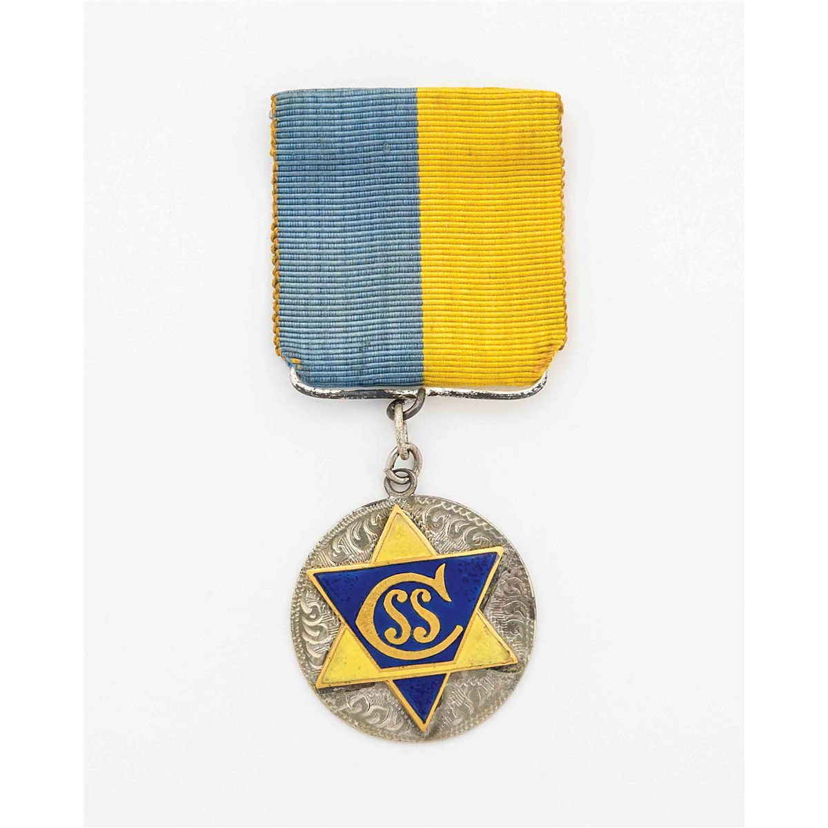 Quality original 1908 Swedish swim club badge presented to a swimmer that participated in the 1908 Summer Olympics in London, England. Badge measures 3? long with the ribbon, and approximately 1? in diameter. Medallion portion bears a six-pointed color star with “SSC [Swedish Swim Club]” in the middle. Reverse is hand-engraved, “Presented by the Swedish Swimming Club to the Swedish swimmers taking part in the Olympic Games in London 1908.” In fine condition, with some light wear to medallion and some very light fading and soiling to ribbon. A seldom offered Olympiad related item.