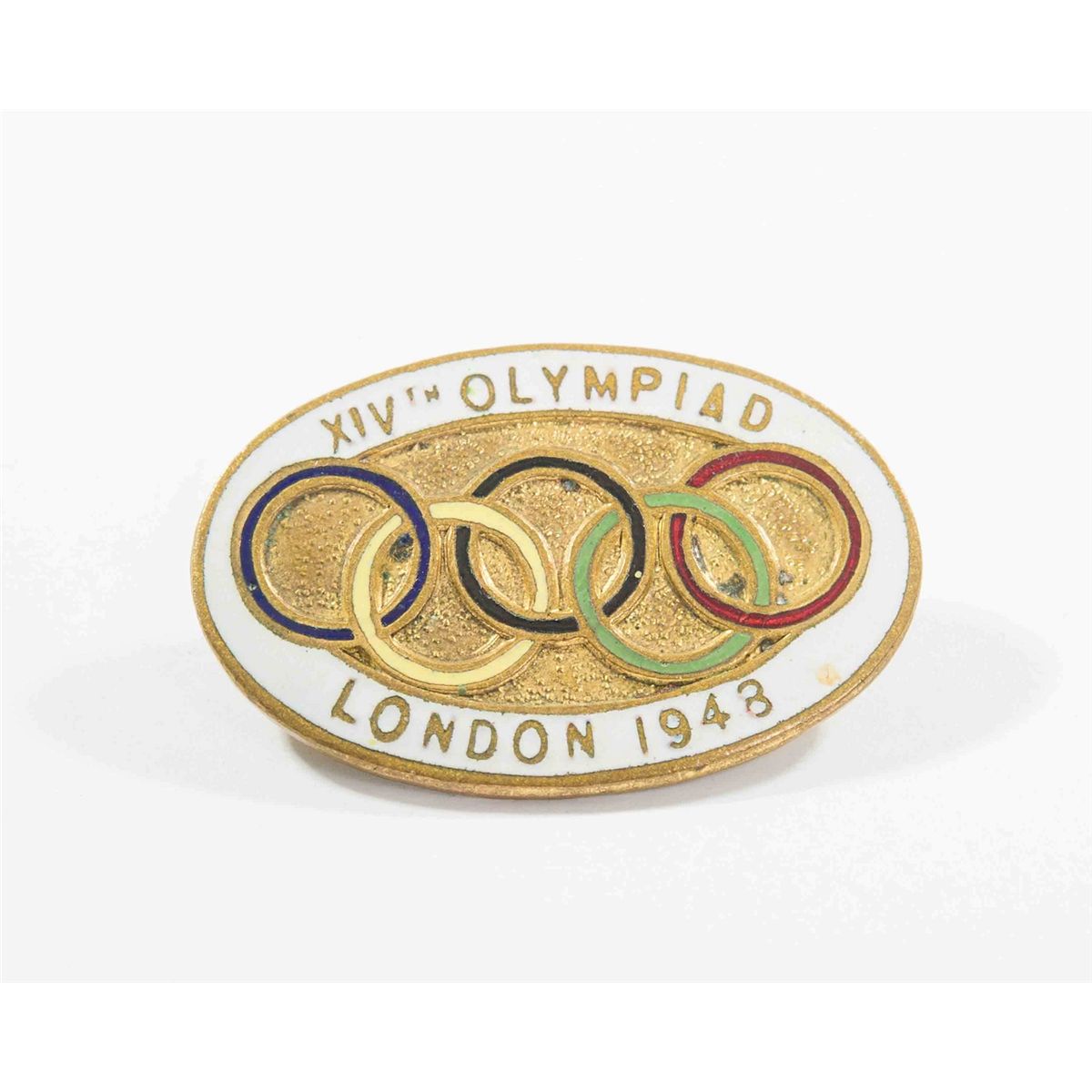 Very appealing pin from the 1948 Summer Olympics held in London, England. Oval-shaped gold-plated pin measures approximately 31mm x 21mm, and shows the Olympic rings in color surrounded by an artistically appealing white enamel oval border, with “XIV Olympiad, London 1948,” in raised letters around the edge. In fine condition. Few pieces were made for these 1948 Olympics due to the economy after the end of World War II.