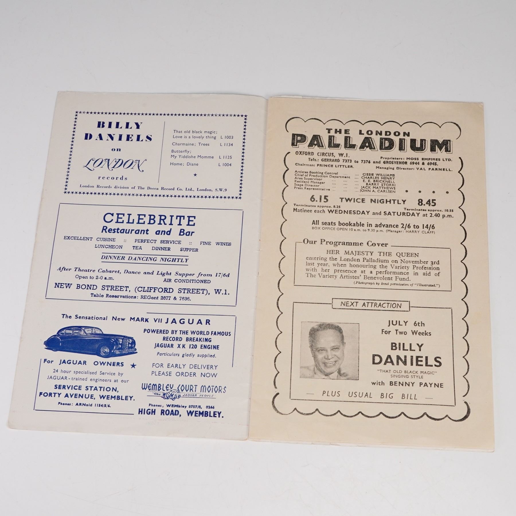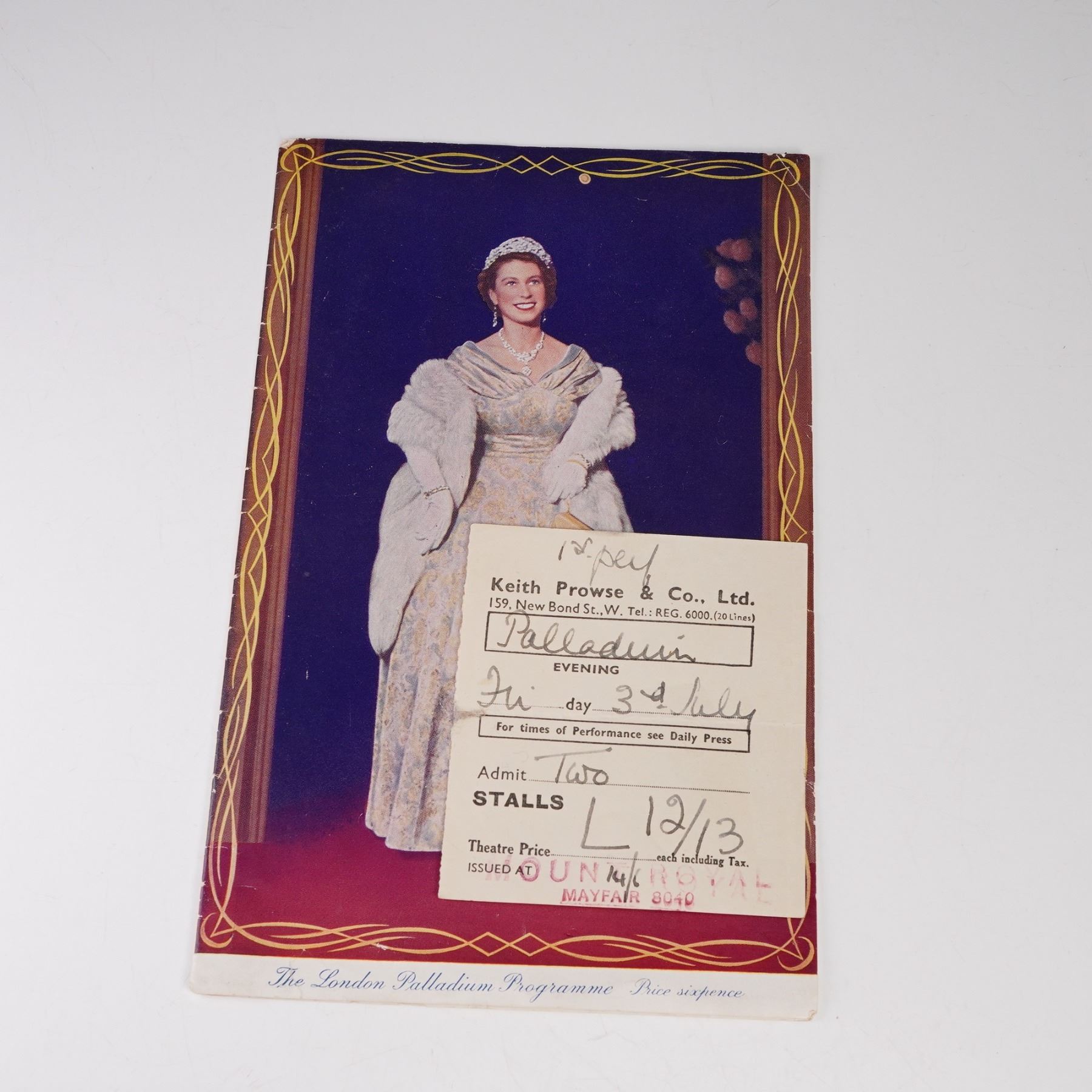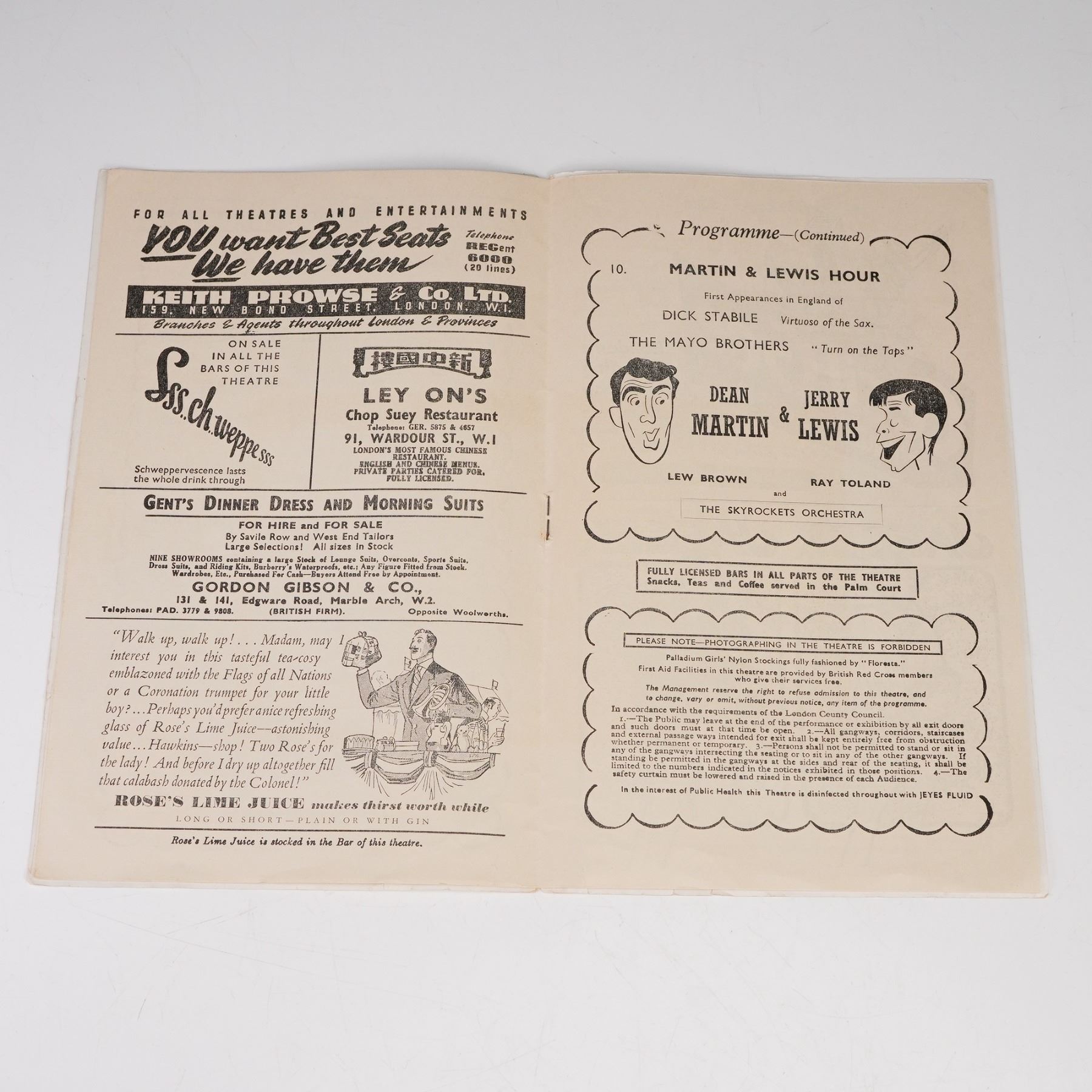 Original souvenir programme from the London Palladium, featuring the first appearances in England of the legendary comedy duo Dean Martin and Jerry Lewis. The cover depicts Her Majesty The Queen attending the London Palladium for the Variety Artists' Benevolent Fund. The programme includes period advertisements and the full billing of acts, including Dick Stabile, The Mayo Brothers, and The Skyrockets Orchestra. Accompanied by the original ticket stub dated Friday, July 3rd, issued by Keith Prowse & Co. Ltd. This piece captures the glamour of mid-century London theatre and the early international career of Martin & Lewis, one of the most iconic comedy teams of the 20th century. General handling wear with light toning and minor creases, consistent with age. Ticket stub affixed to front cover.